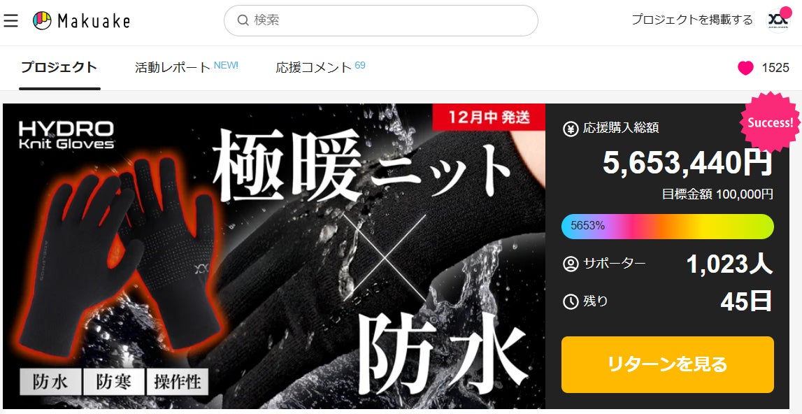 株式会社アデルフォスが手がけた**防水ニットグローブ「Hydro Knit Gloves」**が、クラウドファンディングサイト「Makuake(マクアケ)」で多くの方に共感をいただき、開始3日で支援総額565万円、1023名の方々からのご支援を達成しました。