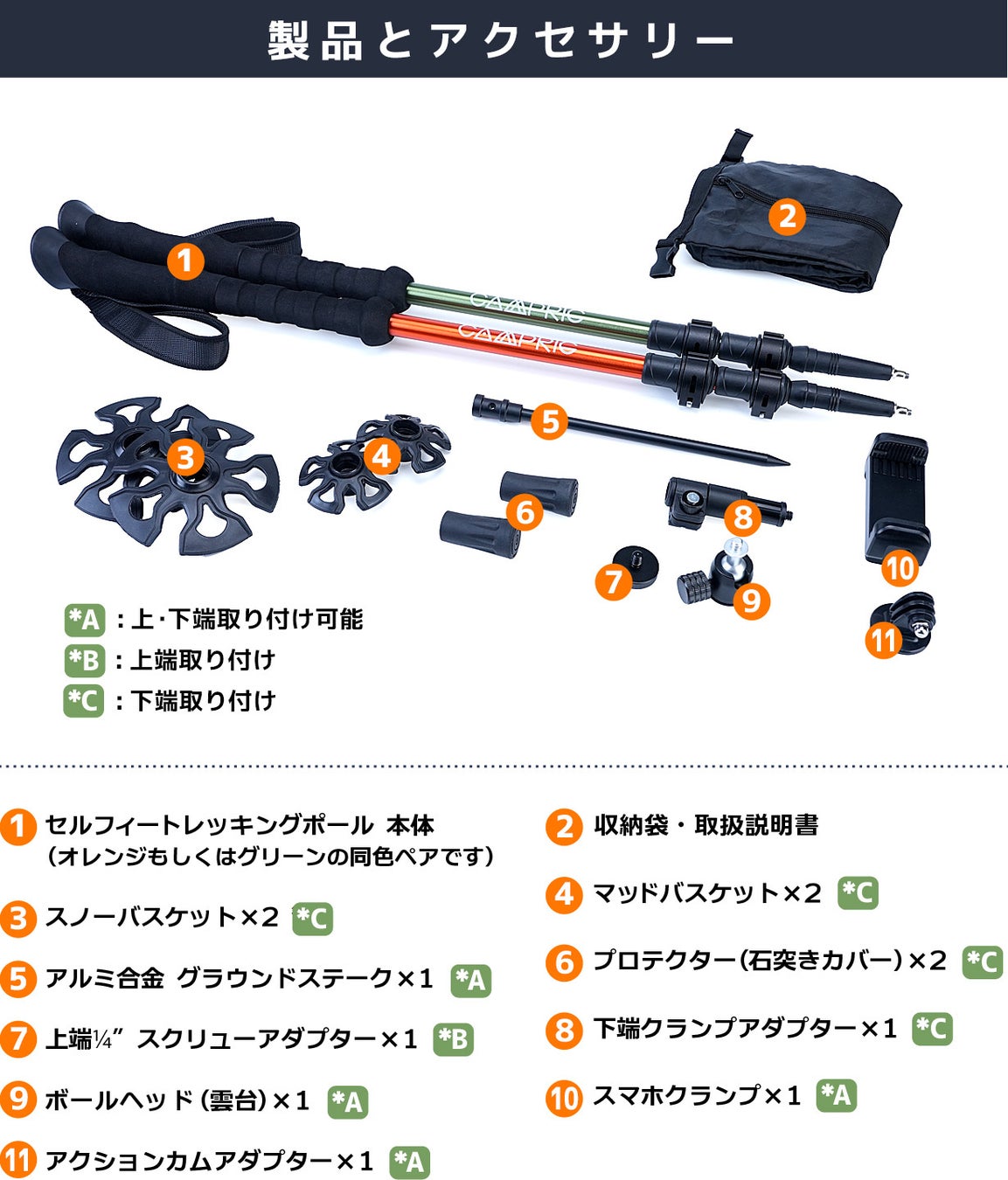 雲台や雲台に取り付け可能なスマートフォンホルダー、アクションカメラホルダーやグランドステーク(ペグ・一脚)、スノーバスケット等の豊富なアクセサリーが標準で付属。スマートフォンは、縦向き・横向きどちらでも撮影が可能です。また、雲台を取り付ける事により、自由な角度設定が可能となり、コンパクトデジタルカメラやアクションカメラの画角設定の幅が広がります。登山だけでなく、旅行や日常の様々なシーンで活躍します。