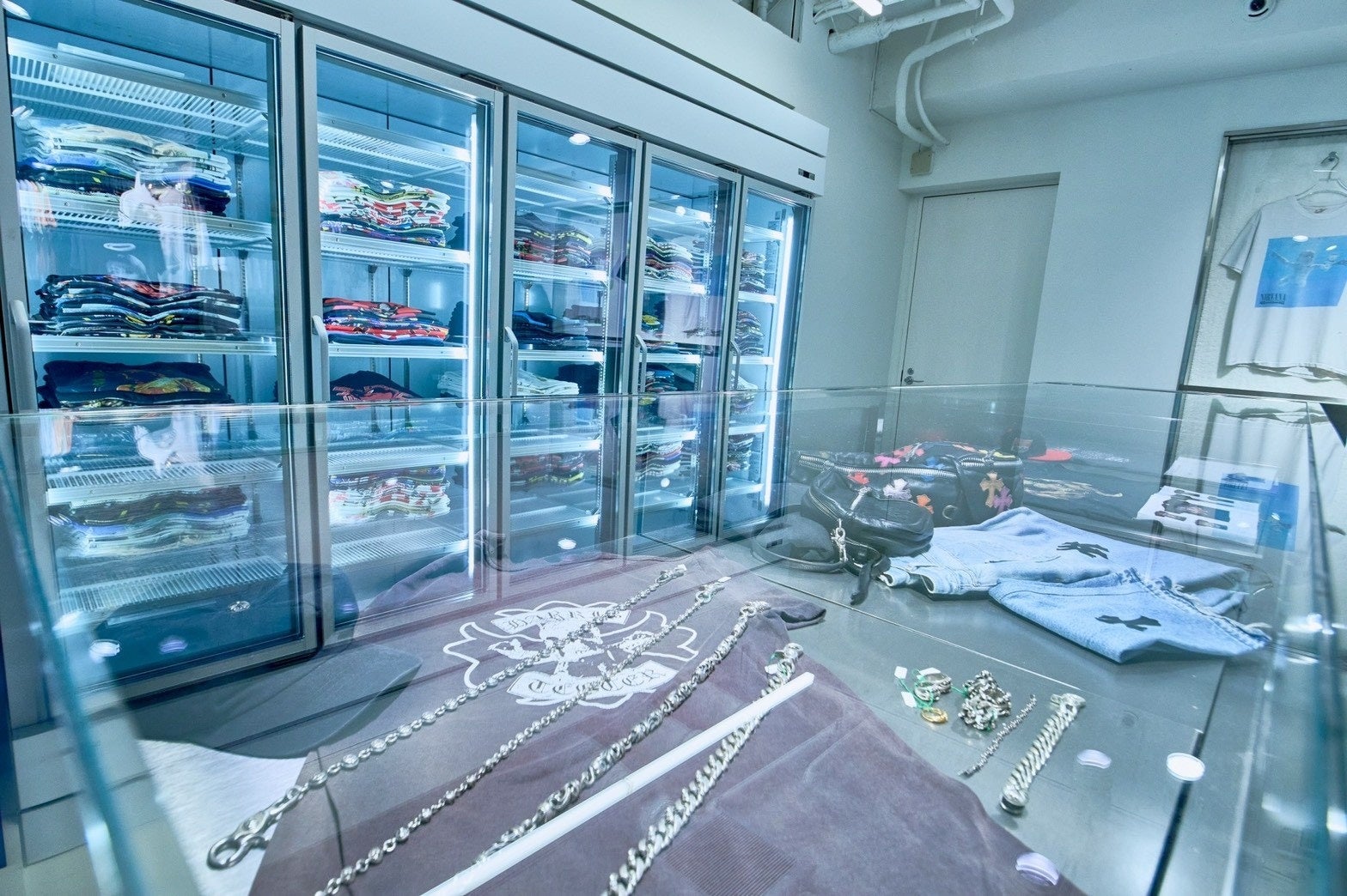壁面には冷蔵庫型のショーケースを設置、天井からは一点物のTシャツが吊り下げられ、中央にはインダストリアルな什器が配置されており、“近未来のコンビニエンスストア”のような高揚感と、“ギャラリー”のような静謐さが共存する空間を演出。
