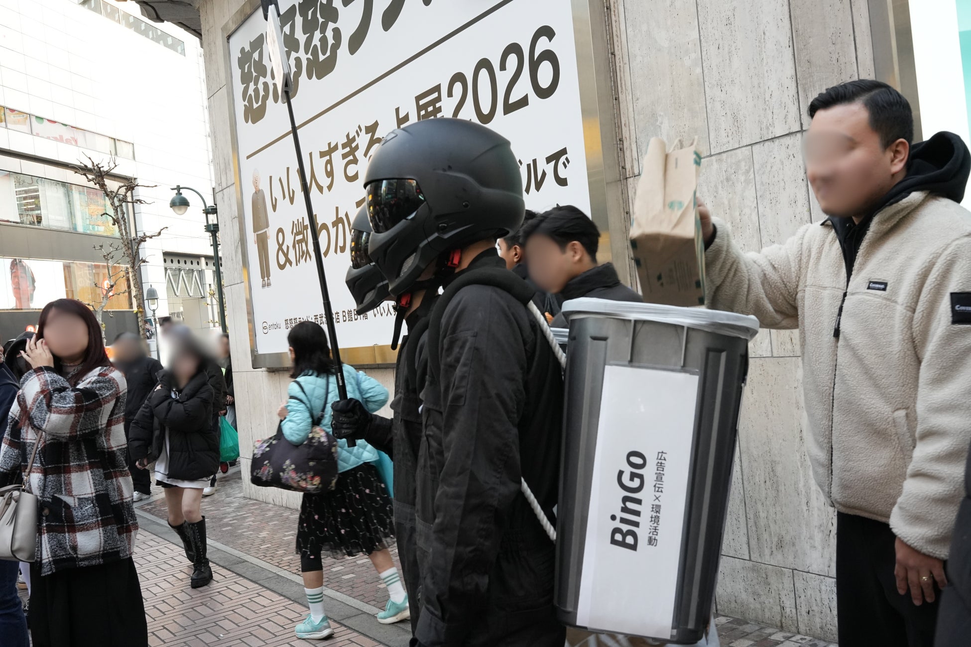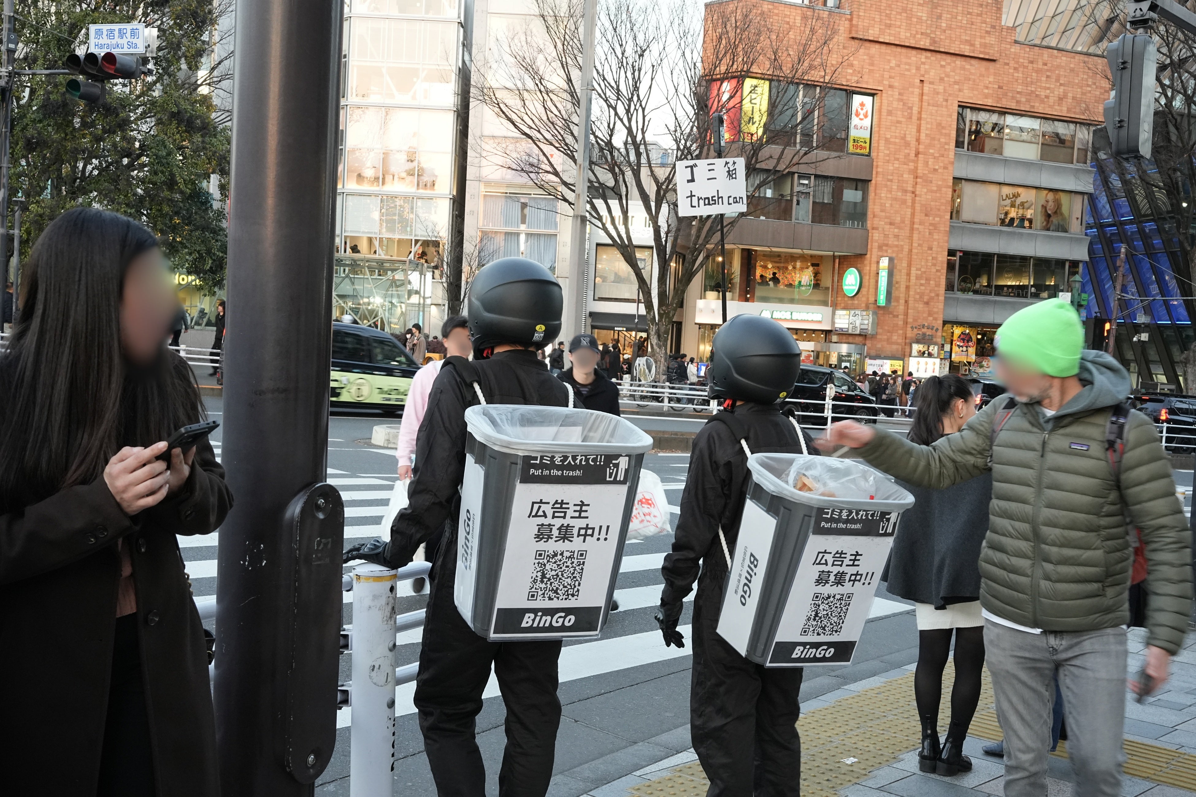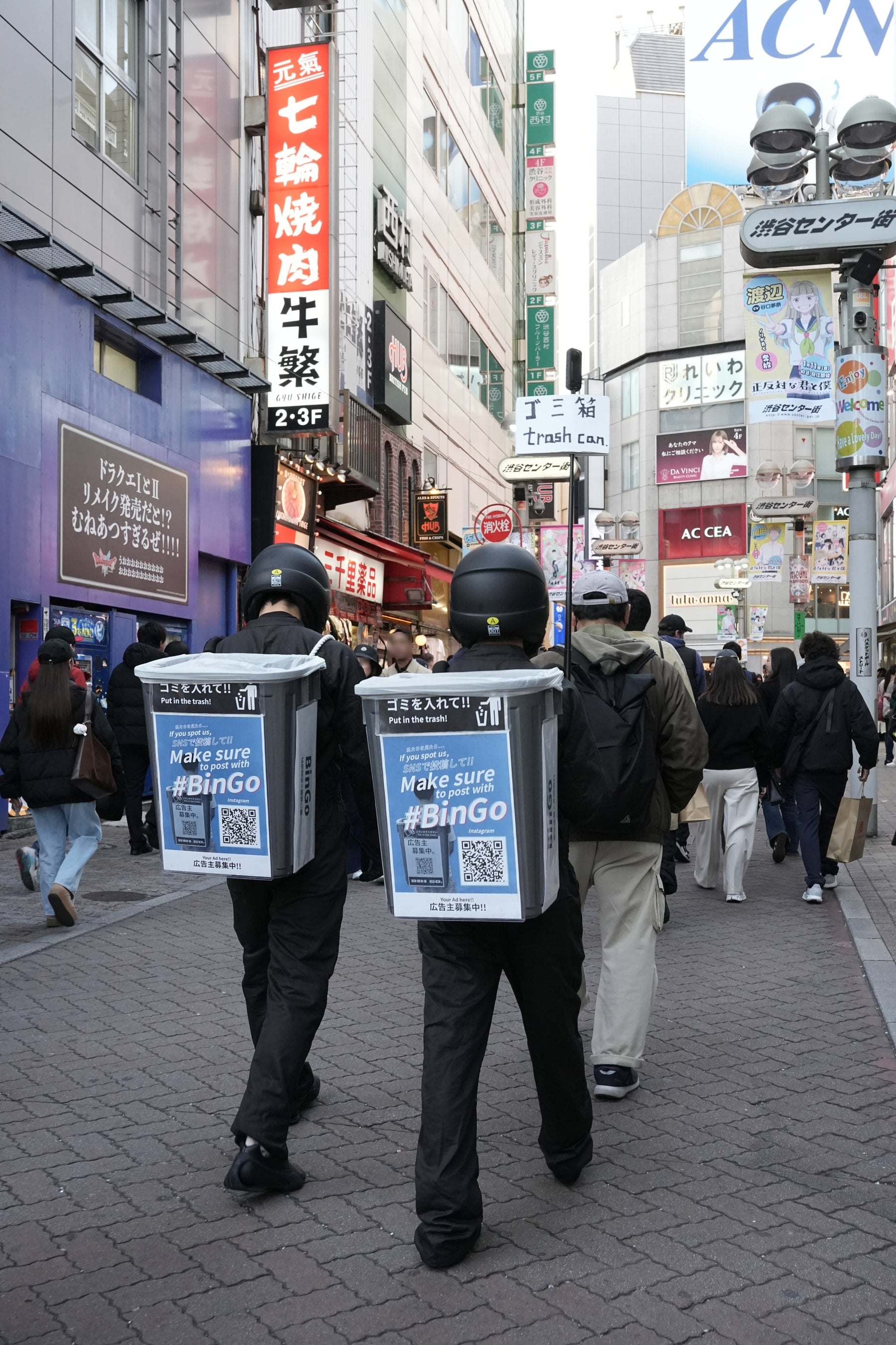 「BinGo」は、広告枠を備えた専用のゴミ箱を背負ったスタッフが、渋谷・原宿・浅草などの繁華街を巡回し、観光客や通行人のゴミを回収しながら企業のプロモーションを行うサービスです。 「ゴミを捨てる」というポジティブなアクションを通じて広告に接触するため、従来の広告媒体にはない深いブランド体験を提供します。