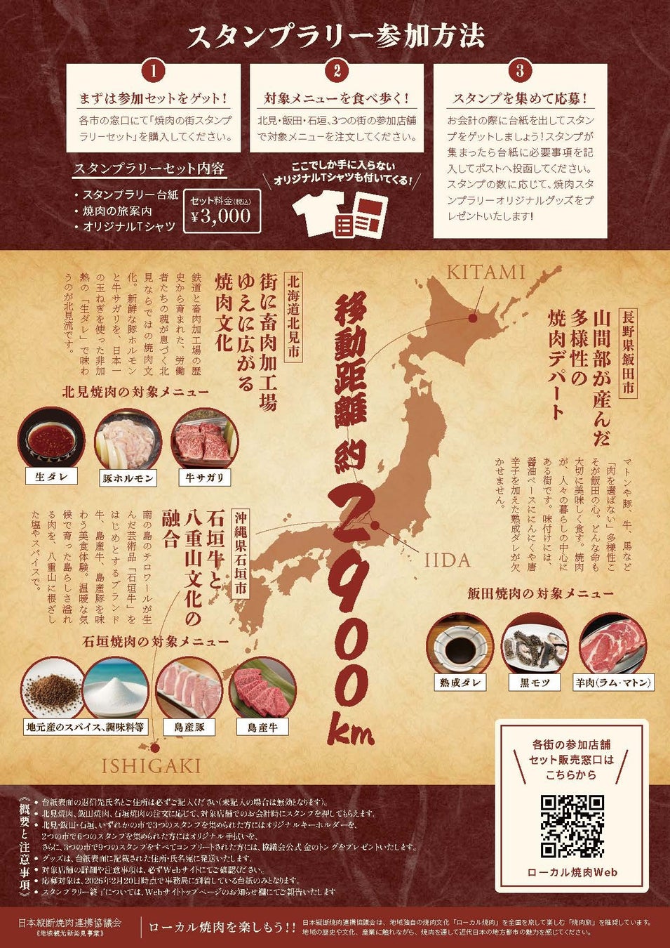 北海道北見市・長野県飯田市・沖縄県石垣市、日本随一の焼肉店数と独自の焼肉文化を持つ焼肉のまち3都市が連携した「焼肉スタンプラリー」の販売を開始します。総移動距離2,900km超、達成者は現れるのか!?