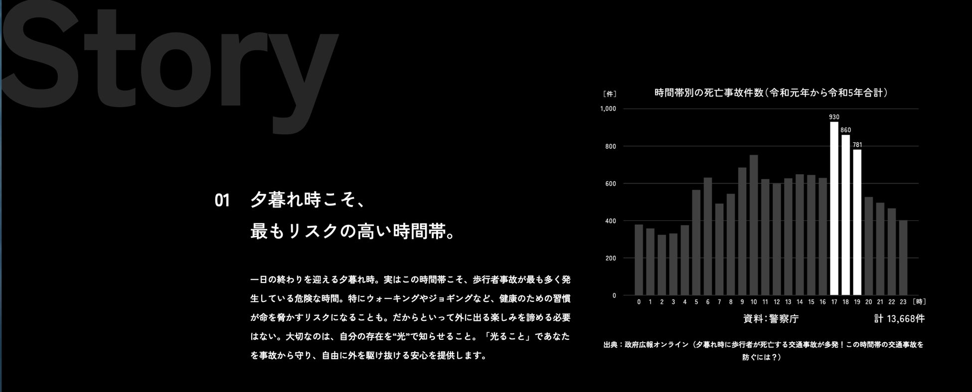 歩行者の交通事故は依然として深刻な社会課題です。株式会社フシミは、これまで交通安全啓発や反射材の研究・開発を通じて培ったノウハウを、ファッションという新たなフィールドで昇華させました。「安全は大事だと分かっているけど、いかにも“交通安全グッズ”には抵抗がある」という声に応え、日常のファッションとして自然に取り入れられるデザインを実現しています。
