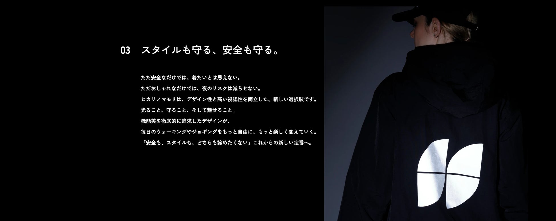 「ヒカリノマモリ」は、“夜でも映える”ファッションを追求しながら、夜道での安全性を確保することを目的とした新しいアパレルブランドです。特殊リフレクタープリントを採用したデザインは、昼はシンプルで洗練された印象を与え、夜は光を反射して存在感を放つ二面性のあるプロダクトです。