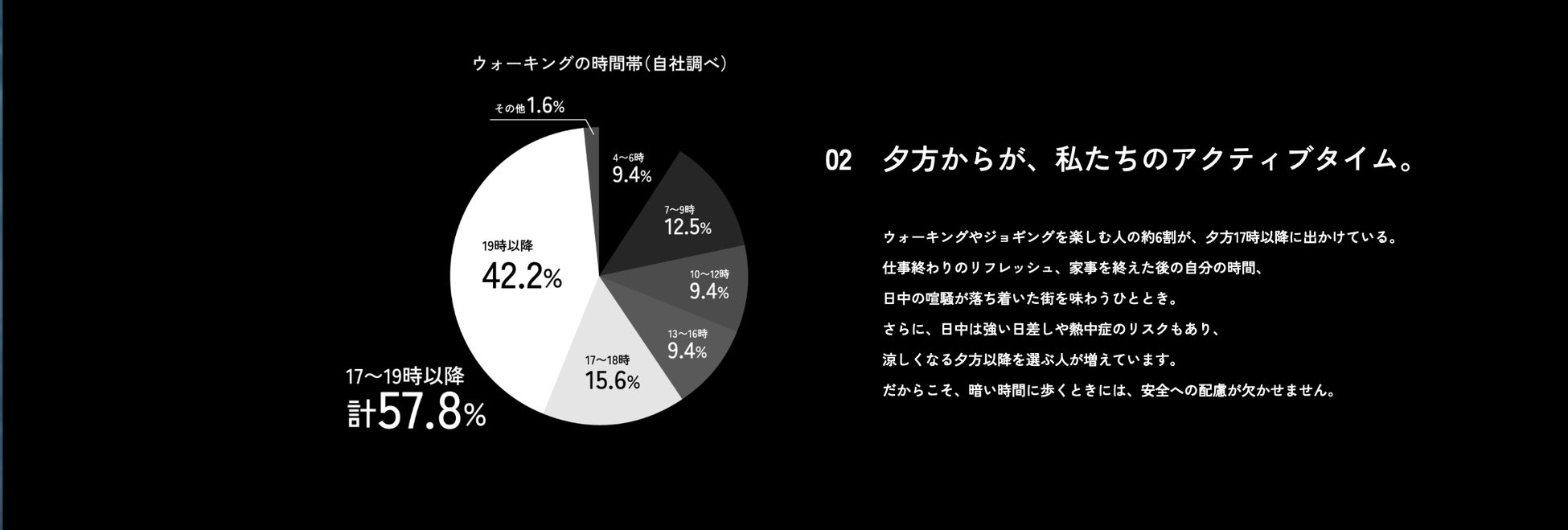 アンケート結果によると、夜間の安全に対して“なんとなく備えたい”と考える層は全体の過半数を占めています。「ヒカリノマモリ」は、意識高い層だけでなく、そうした“なんとなくあった方が良い”と考える人たちにも寄り添うブランドです。普段のコーディネートを崩さず、さりげなく夜間の安全性を高めるデザインで、誰でも気軽に取り入れられることを目指しています。