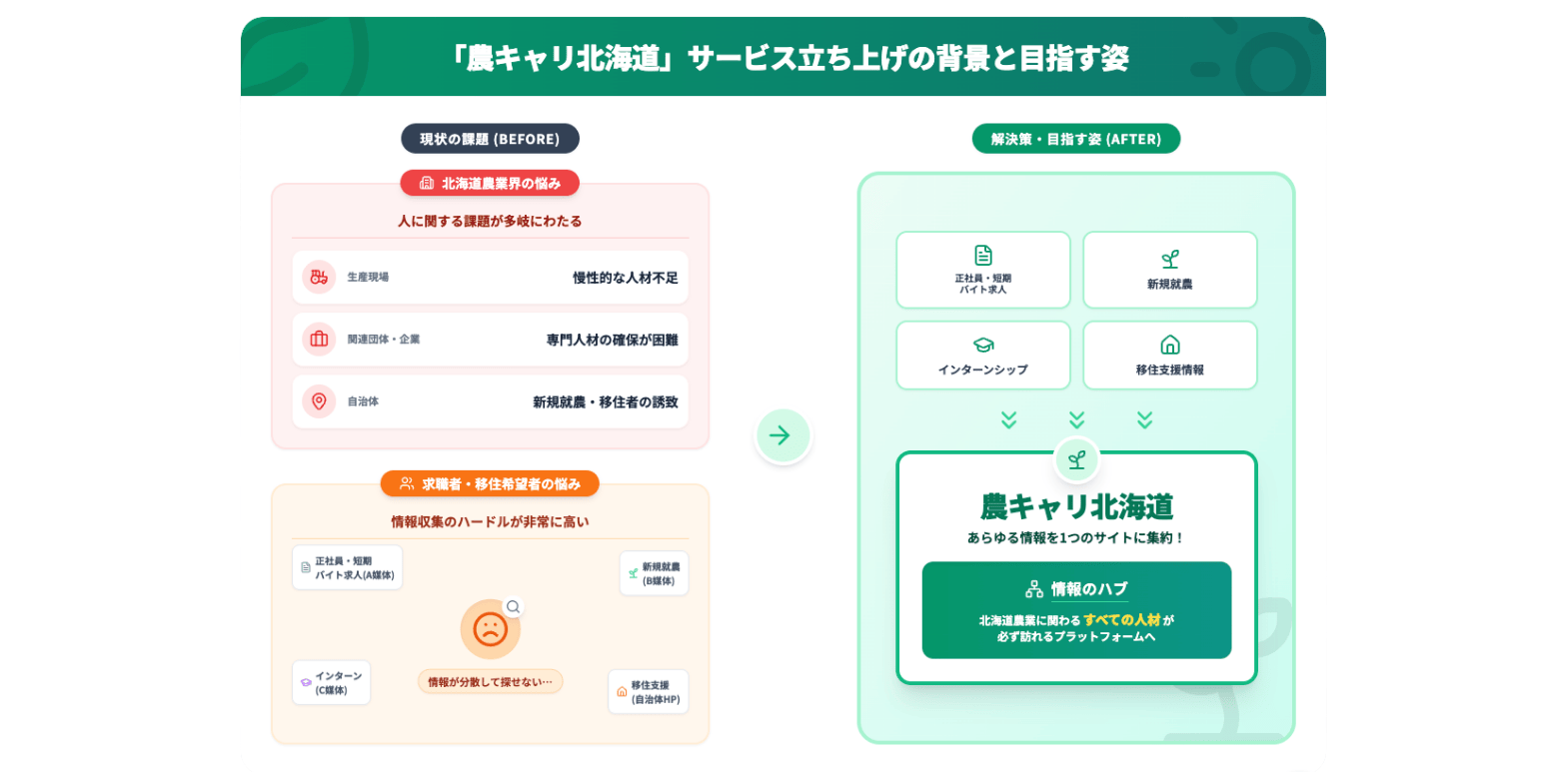 本サービスは、農業特化・北海道特化という強みを最大限に活かし、人材を求める生産者・企業様や、移住者を増やしたい自治体様と、北海道での農業に関心を持つ求職者をシームレスにつなぐプラットフォームです。