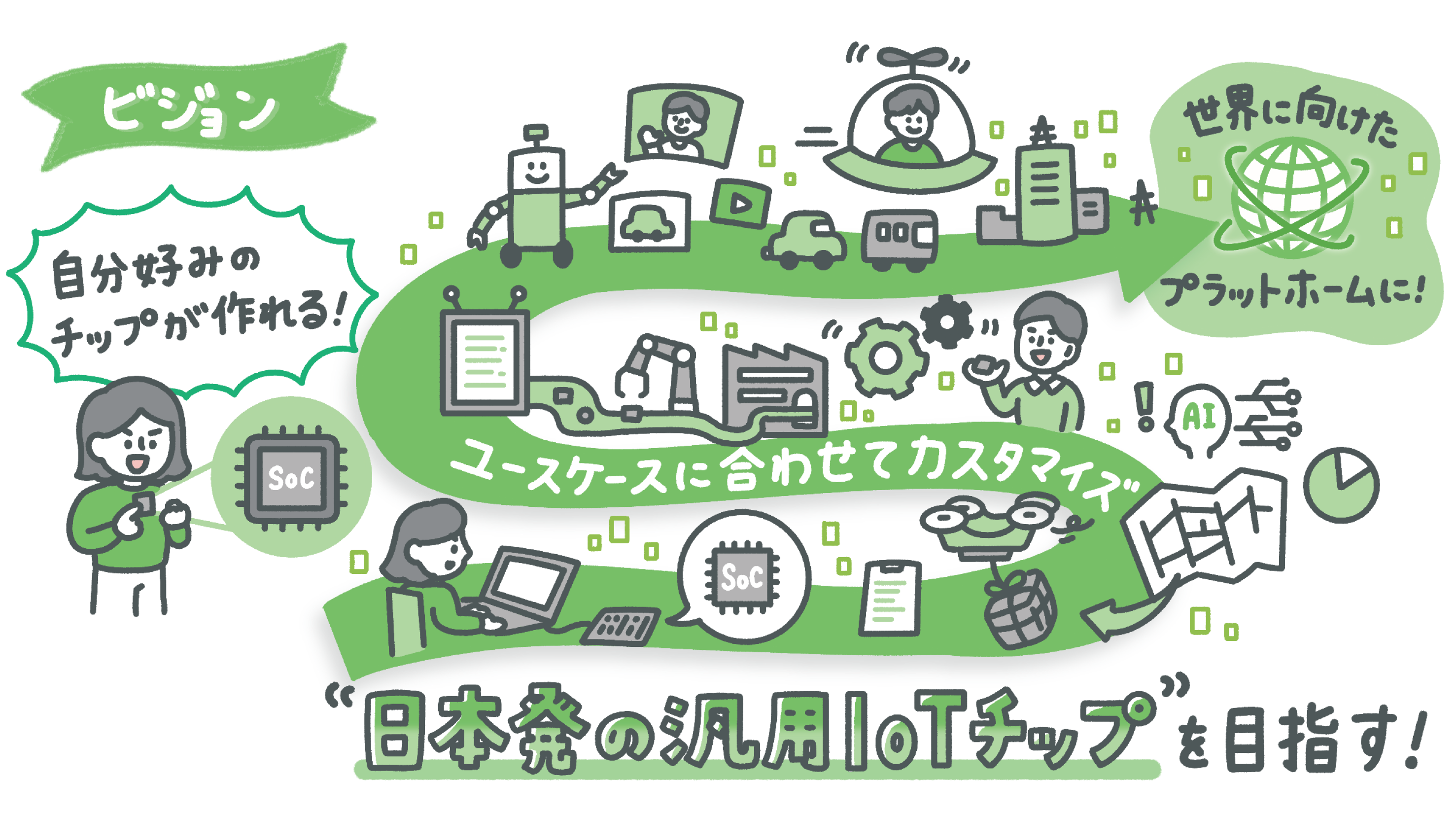 従来はブラックボックス化されていたチップをカスタマイズや、機能のアップデートが可能な通信端末用「汎用IoTチップ」の開発によって、工場、自動車、監視向け等各種機器等の広範な用途にチップの継続的な使用が可能になります。