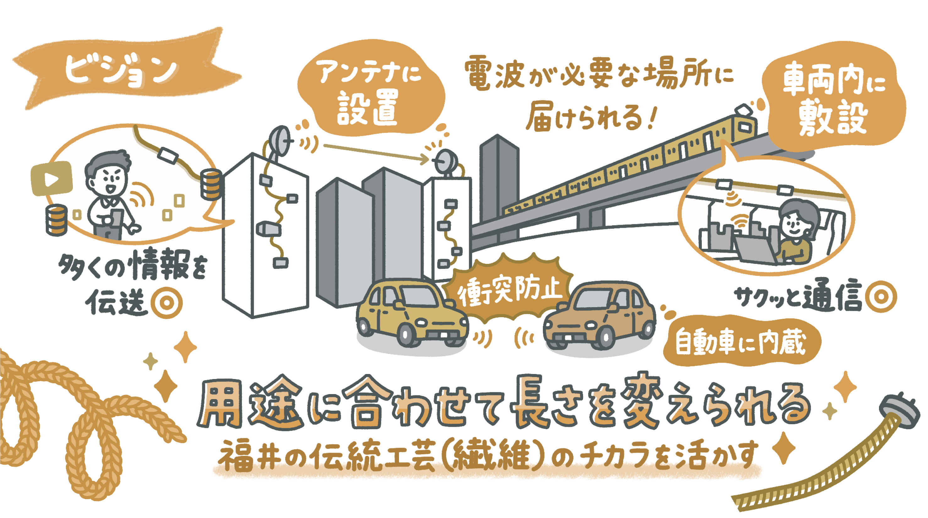 ミリ波から、テラヘルツ波帯等の高周波向け導波管。福井の繊維技術を活かして、用途に合わせて長さや形状を変えられるフレキシブルな導波管を開発。Beyond 5G通信用アンテナの自由な配置や、自動車等の移動体通信、内視鏡等医療機器への活用が期待されています。