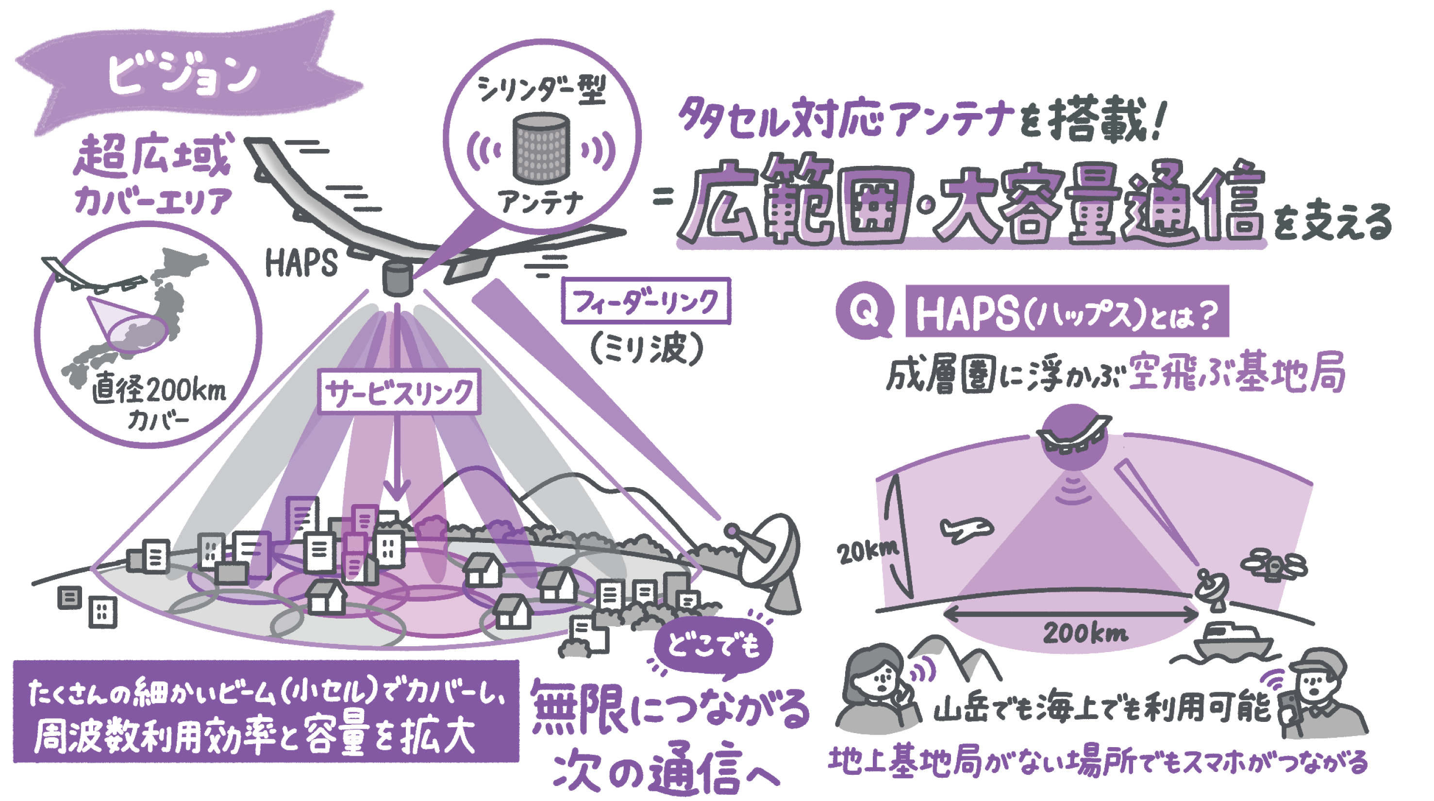 HAPS(高高度通信プラットフォーム)は高度約20kmの成層圏を飛行する無人航空機等からのアンテナを用いて通信サービスを提供するいわば「空飛ぶ基地局」です。地上基地局が無い場所でも通信利用を可能にし、災害対策や広域のリモートセンシングへの活用に期待されています。