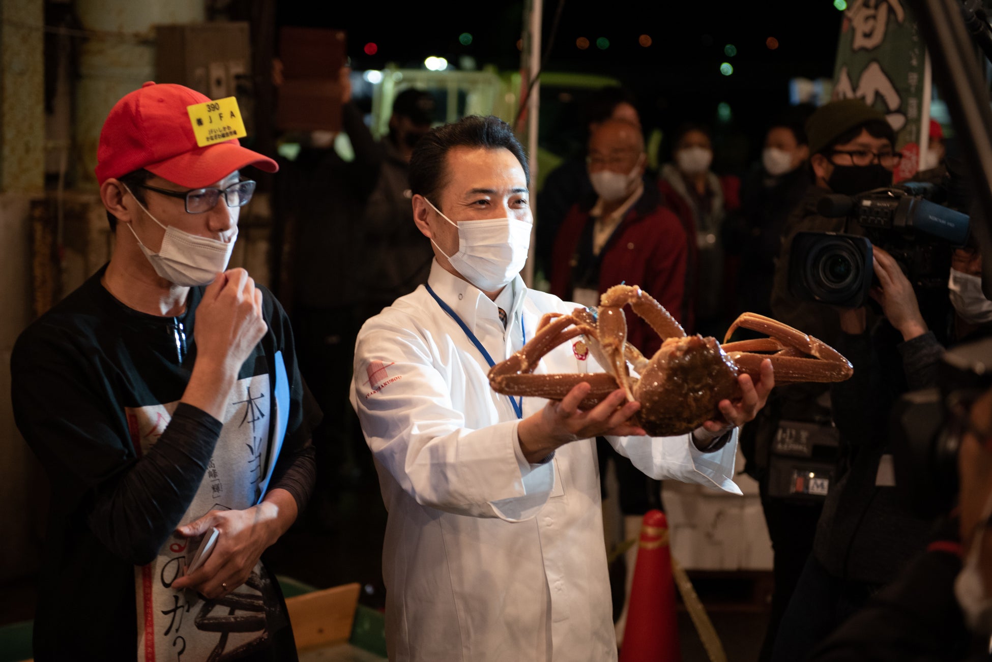 グランプリのカニを落札した仲買人への取材、撮影の時間を撮る。 |