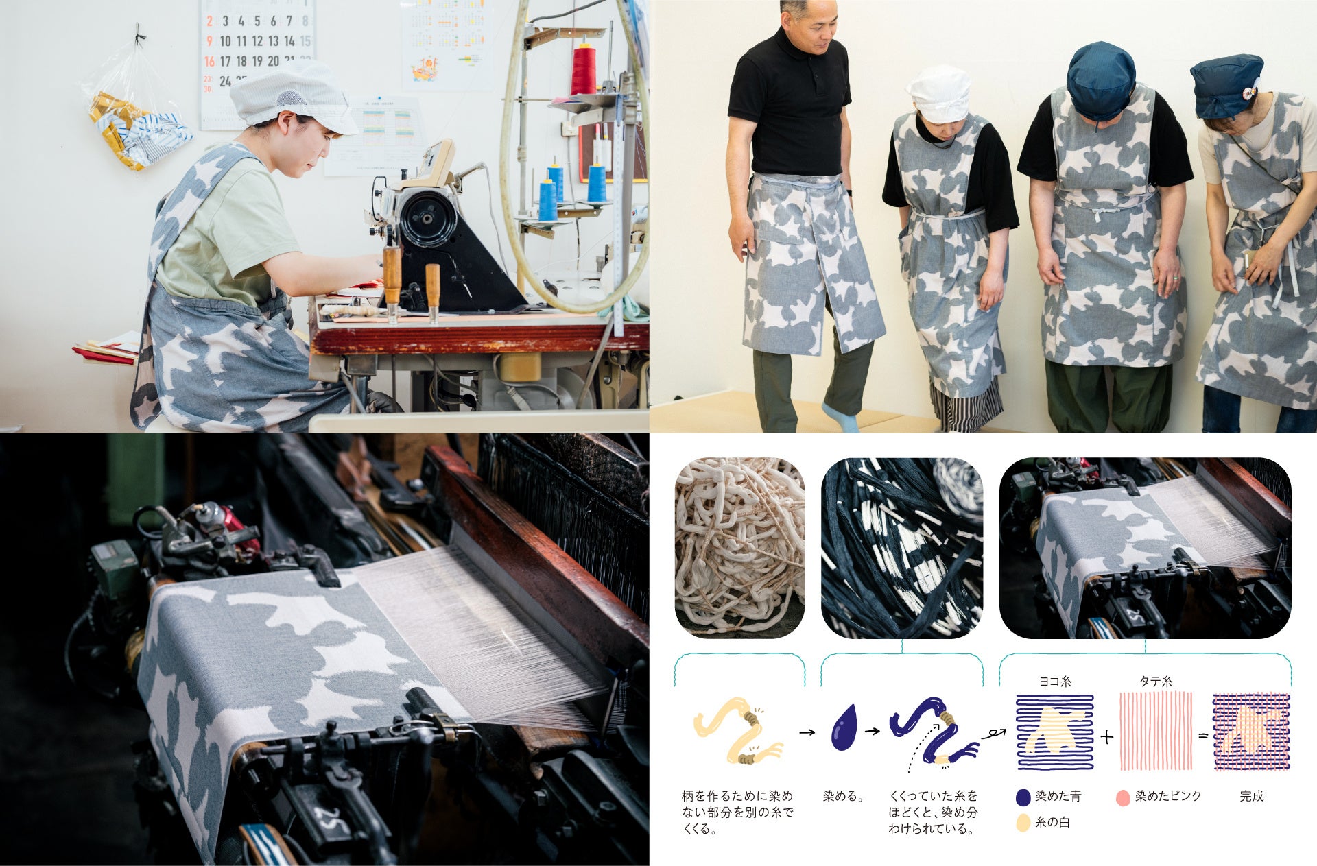 縫製会社らしい強みが発揮できるプロジェクトとして、ユニフォーム刷新を企画。同じ九州の特産品であり、重要無形文化財にも指定されている久留米絣で、オリジナルの生地を作るところからスタートしました。ポケットの位置や数、エプロン丈、ひもの長さなどは働き手が自由にカスタマイズすることが可能です。ユニフォーム制作を通して、伝統的な織りや染色の過程、テキスタイルデザインの工程を体験し、全社員に共有することで、「自社でオリジナルの服を作れるようになる」という未来像に向けた意識も高まりました。