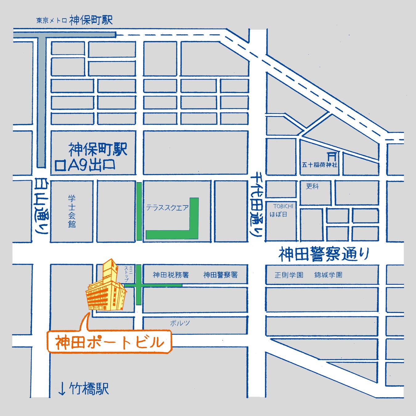 【場所】神田ポートビル、神田ポートビル前道路、神田税務署駐車場、神田税務署裏道路、テラススクエア西側道路、テラススクエア公開空地
