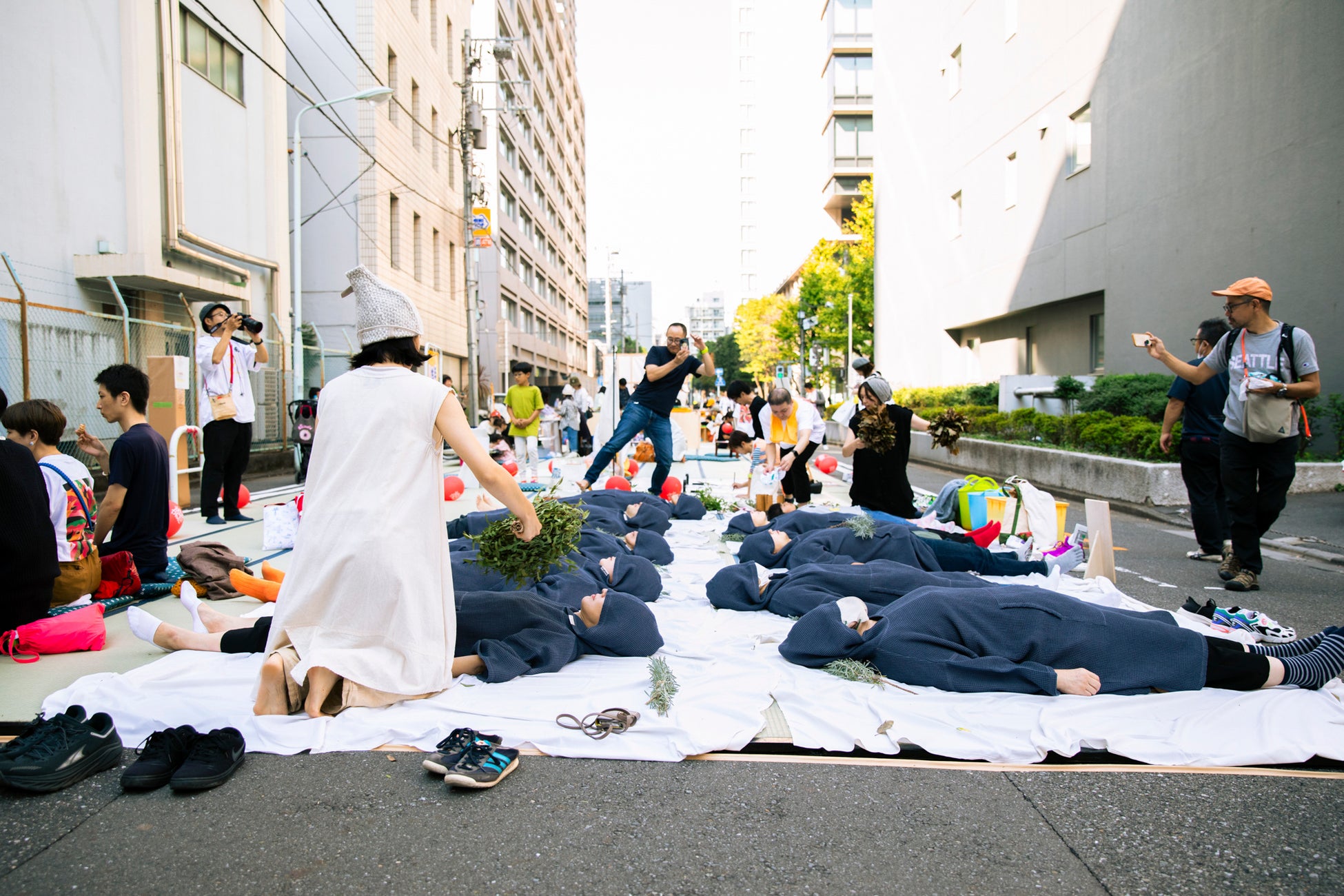 路上に敷かれた300畳の畳に、そっと足をふみ入れると、都会のまんなかにひらかれた「内側」の空間があらわれます。そこから見える景色には、まだ体験したことのない感覚の世界が広がっていて、内と外の境界は次第に気にならなくなっていきます。ビルのすき間から見える空は、まるで大きな窓のように、場全体をやさしく照らします。