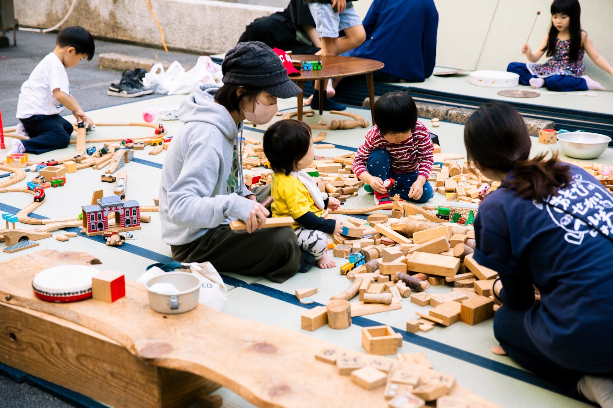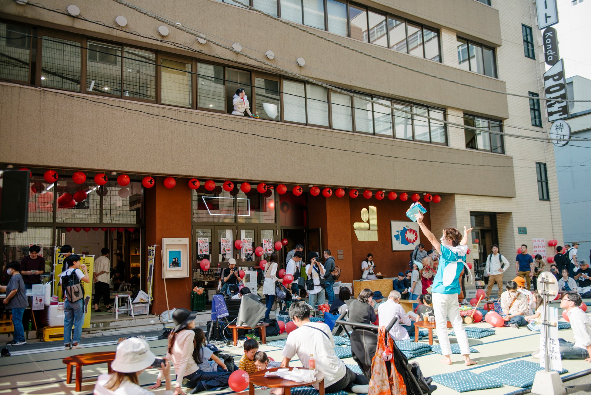 この縁日には、「こんなやり方があったんだ」や「なんだかちょっと楽になった」といった声が、自然と集まってきます。見方や考え方を、少しだけやわらかく変換するようなアイデアが、ここにあります。縁日では、会場となる路上や建物の中に、合計300畳の畳が敷かれています。普段、畳の空間は「内と外のあいだ」を感じさせるものですが、靴を脱いで路上の畳に一歩ふみこめば、そうした境目の感じ方が違うかもしれません。路上の畳からは、ビルの隙間から見える空や、人と人がたのしそうに過ごす様子が広がっている時間が流れています。