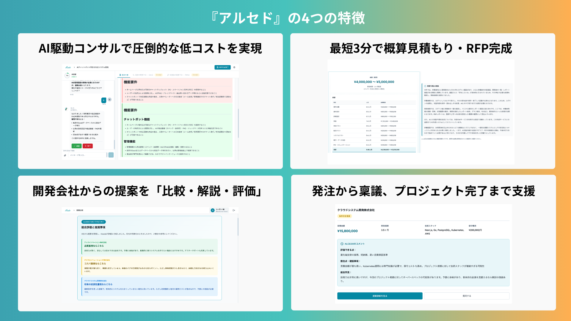通常、システム開発の知見がない発注者が最適な開発会社を選定するには、高額なITコンサルタントを雇うか、自力で勉強するしかありませんでした。『アルセド』は、要件定義や見積査定といったコンサルタントの業務をAIが自動化。これにより、ITコンサルを雇うよりも圧倒的に安いコストで、プロフェッショナルな支援を受けることが可能です。