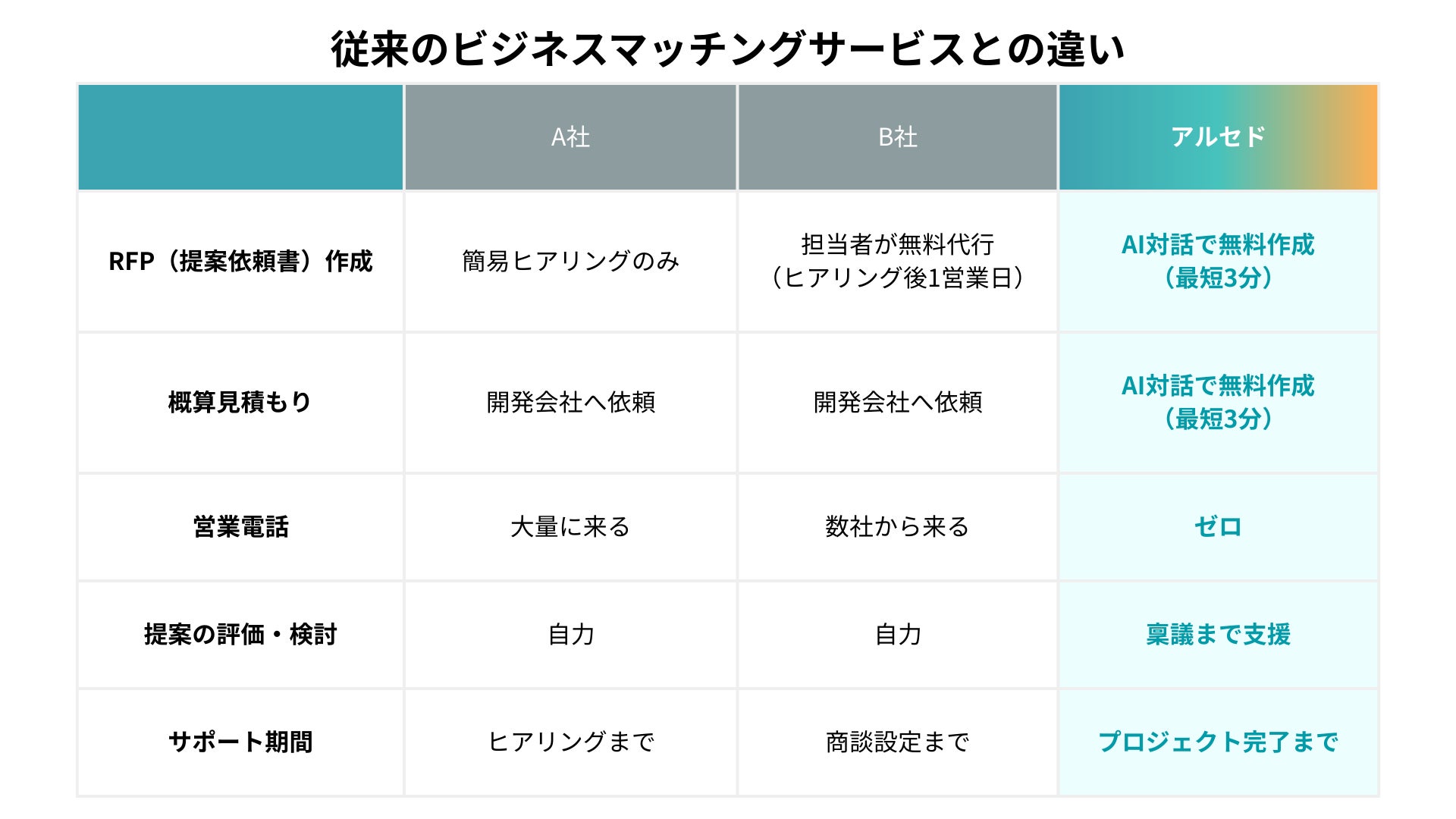 多くのビジネスマッチングサービスが存在する中で、『アルセド』はビジネスモデルそのものを見直すことで、発注者にとっての「納得感」と「効率」を追求しました。