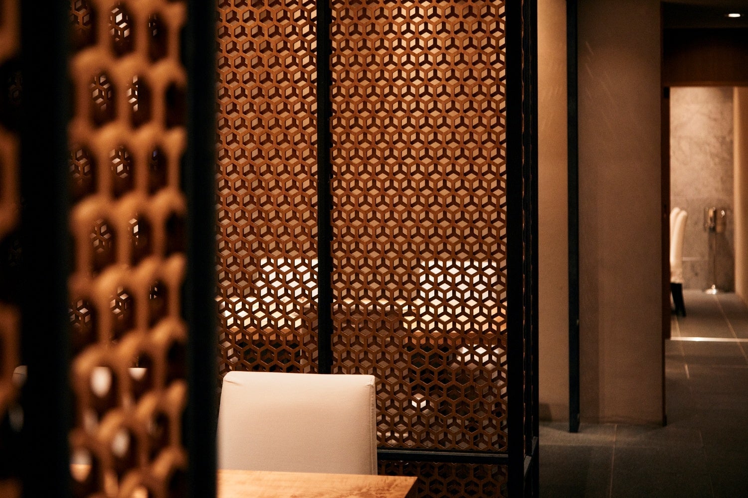 光をやわらかく透かす組子のパーテーションや、手仕事の跡が美しいナグリ加工の床材。