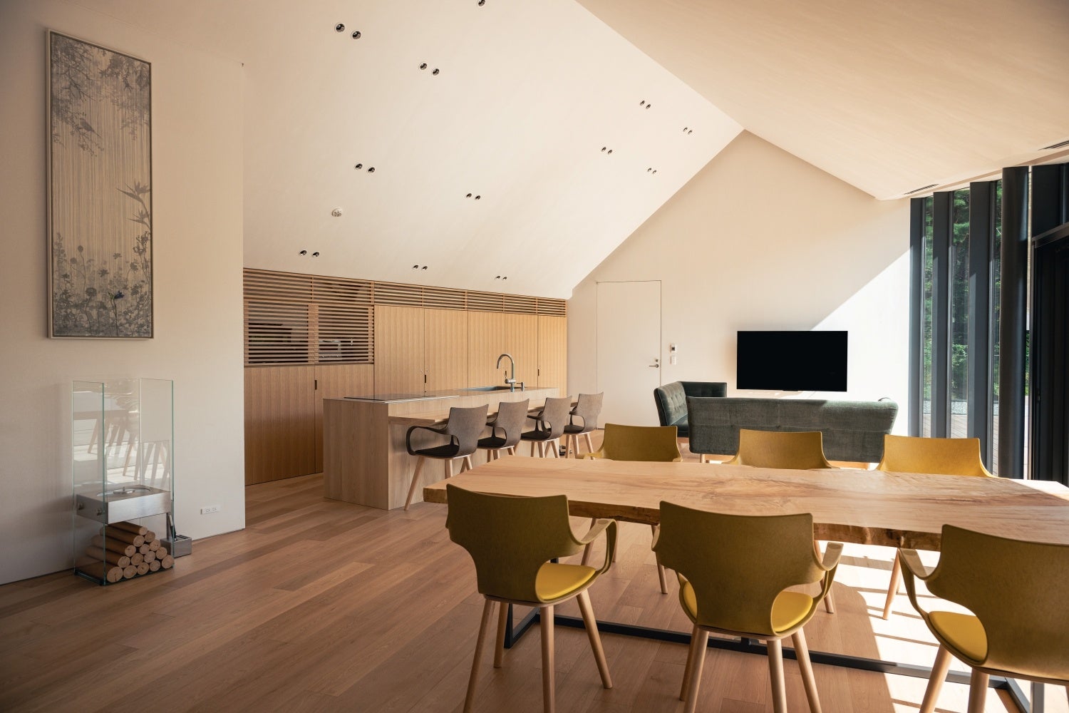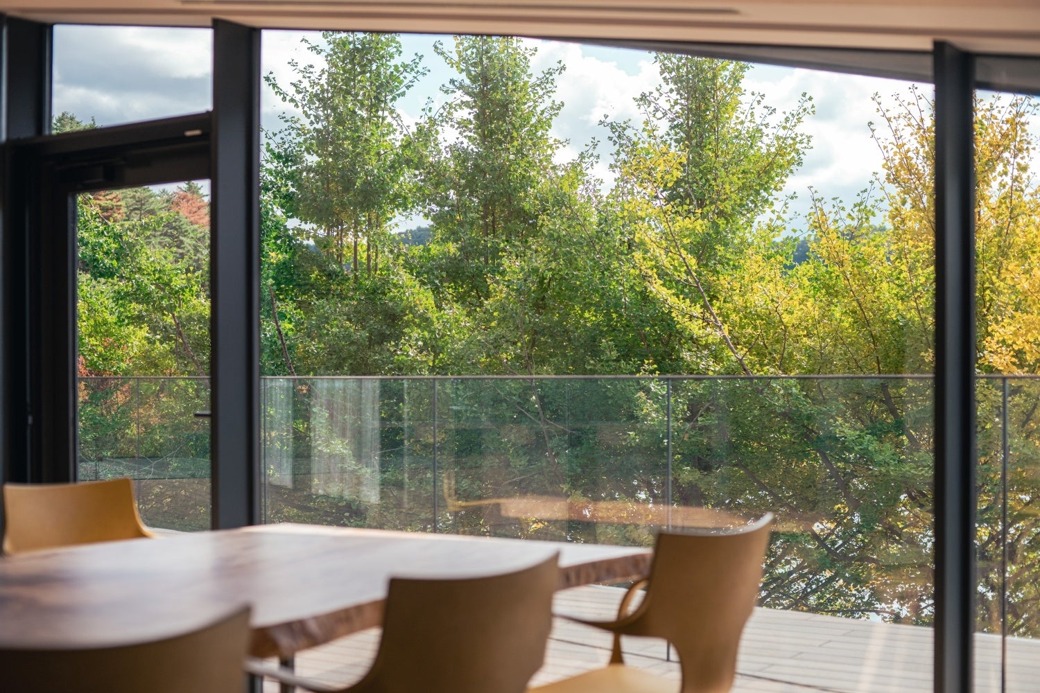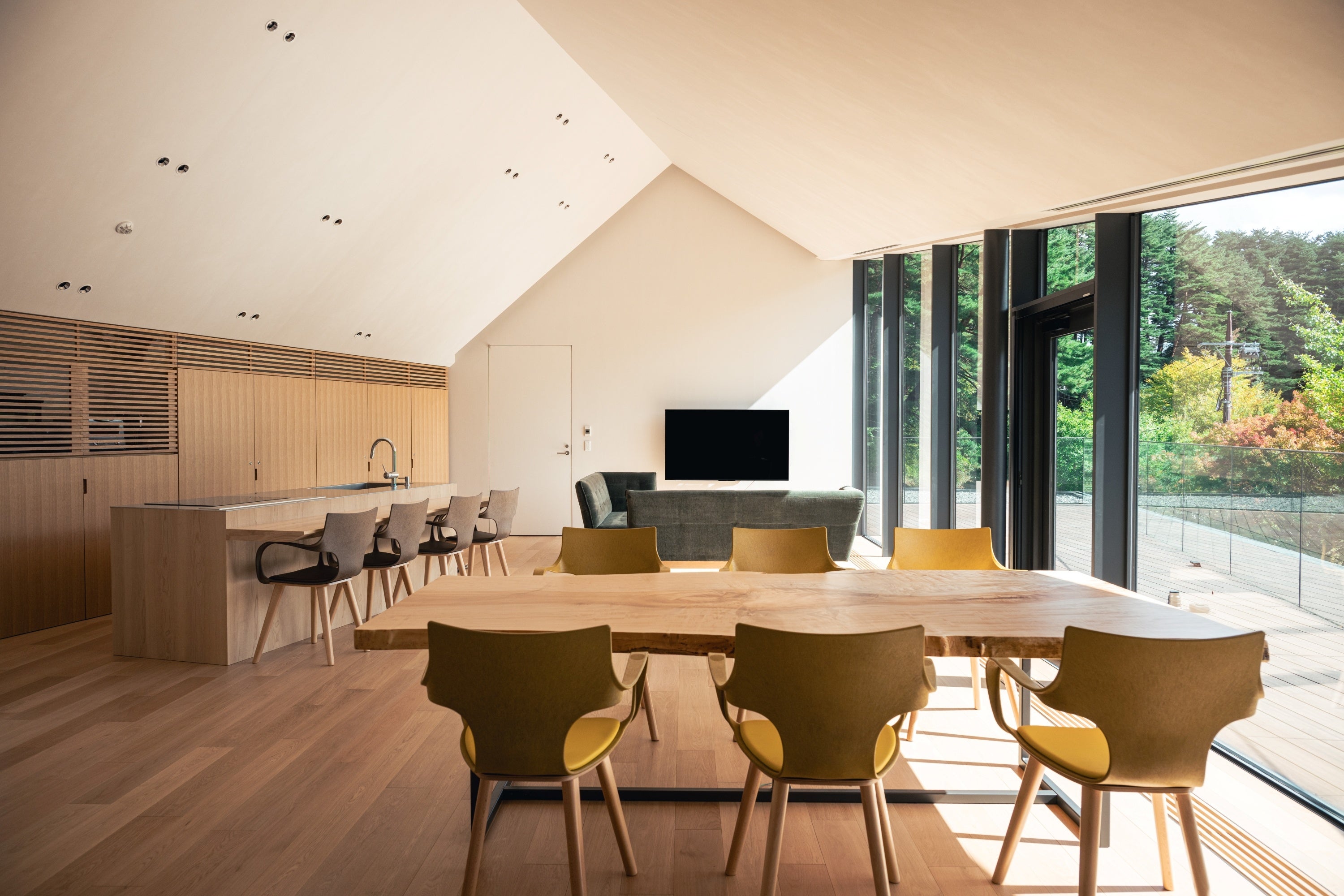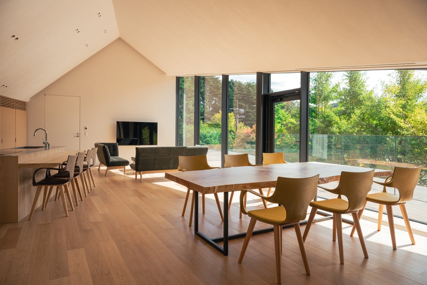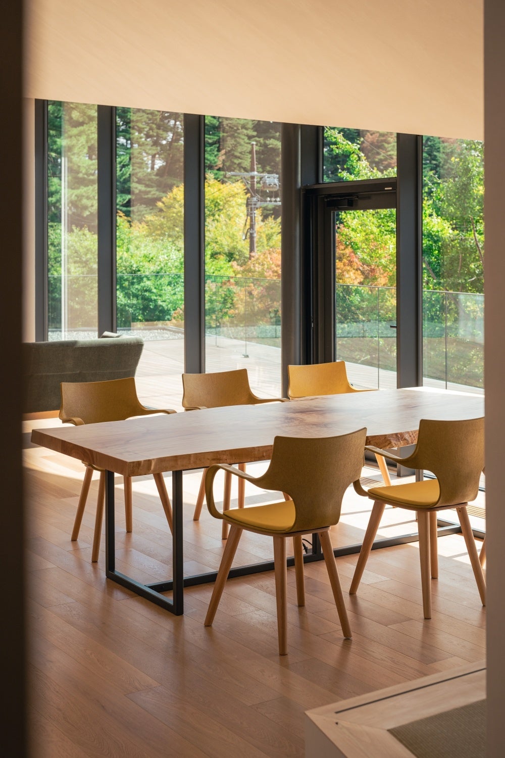 2025 年 10 月、富士山麓の自然と共生する建築に、千年家具が納品した一枚板が設えられました。