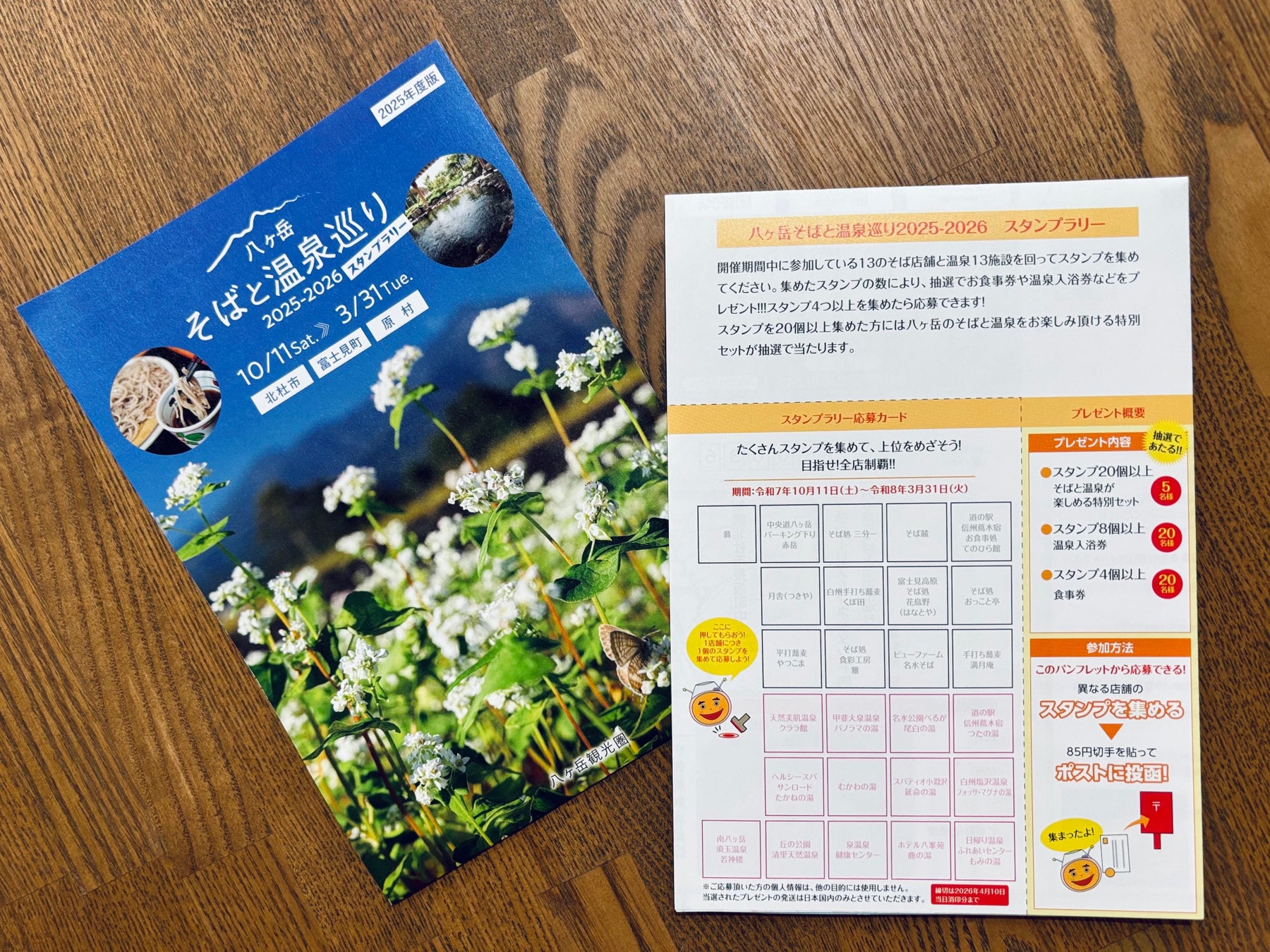 「1000mの天空リゾート八ヶ岳」をブランドコンセプトに、八ヶ岳観光圏(山梨県北杜市、長野県富士見町・原村)の観光地域づくりを担う一般社団法人八ヶ岳ツーリズムマネジメント(所在地:山梨県北杜市、代表理事:小林 勉)は、2025年10月11日(土)から2026年3月31日(火)まで、エリア内のそば店13店舗と温泉施設13施設を巡るスタンプラリー「八ヶ岳そばと温泉巡り 2025-2026」を開催しています。