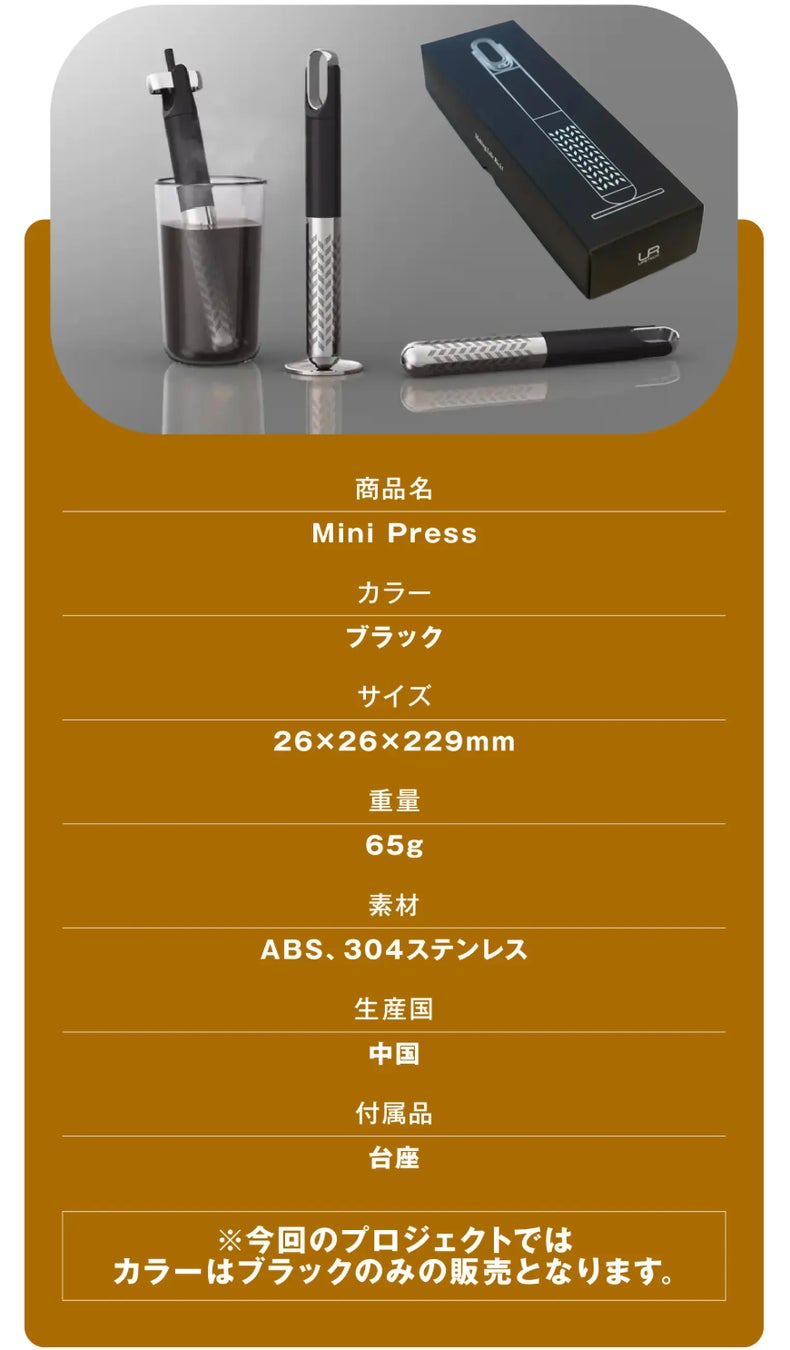 外出先での飲み物に『もう少し何か…』と感じる。そんな日常の小さな妥協をなくしたいという想いから、本プロジェクトを開始しました。軽さ、デザイン性、手入れの簡単さを兼ね備えた「Mini Press」が、皆様の毎日を少しだけ豊かにするきっかけになることを願っています。