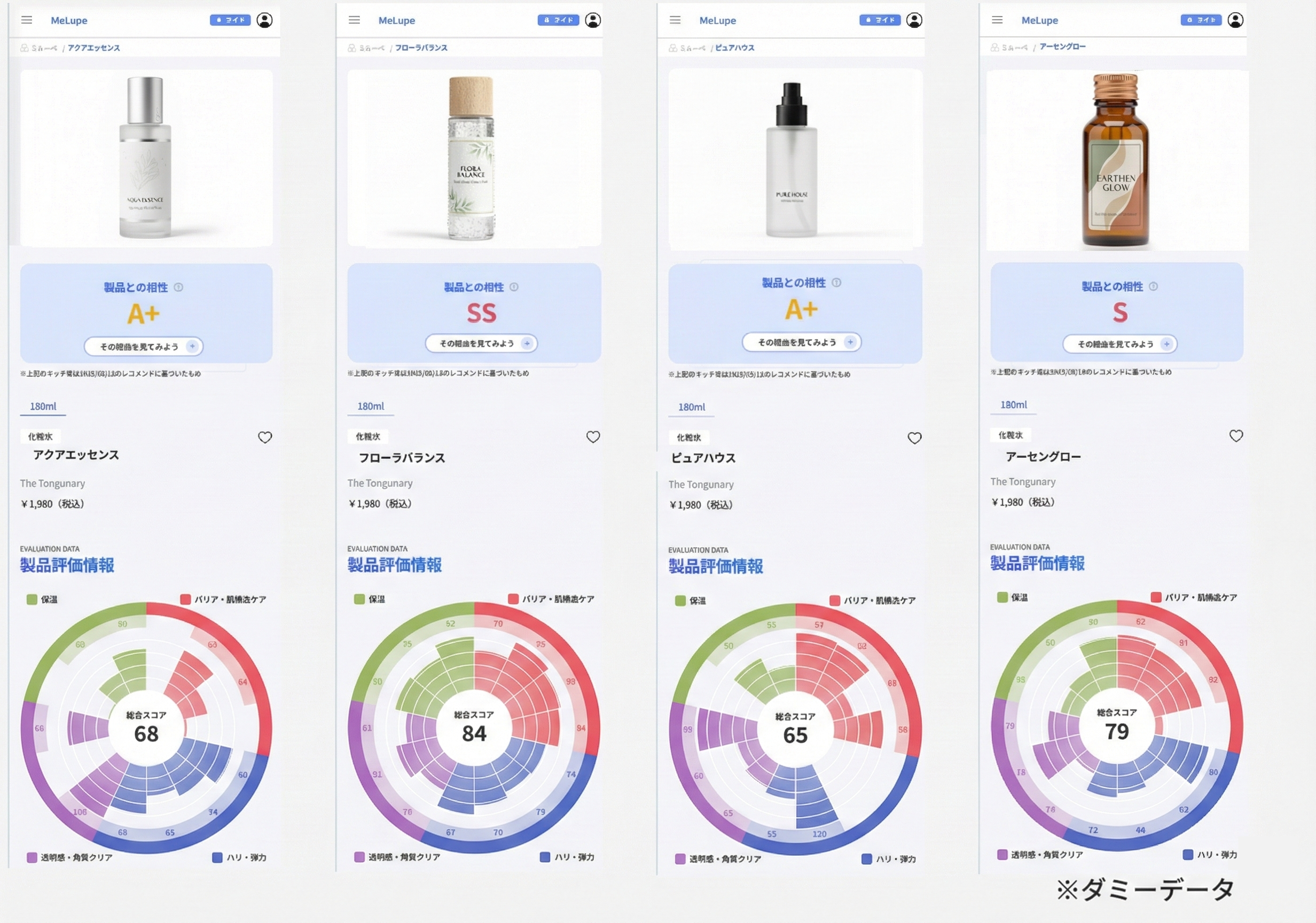MeLupeは、約140製品以上(2026年1月末で400製品予定)のスキンケア製品を対象に、全層型人工皮膚モデルを用いて遺伝子発現を計測し、14の美肌指標に基づいて製品機能を定量評価。製品の違いを一覧化・可視化するとともに、スマートフォンで撮影した肌画像をAI解析し、ユーザーの肌と相性の良い「最適な製品群」を中立的なデータに基づいて提案します。
