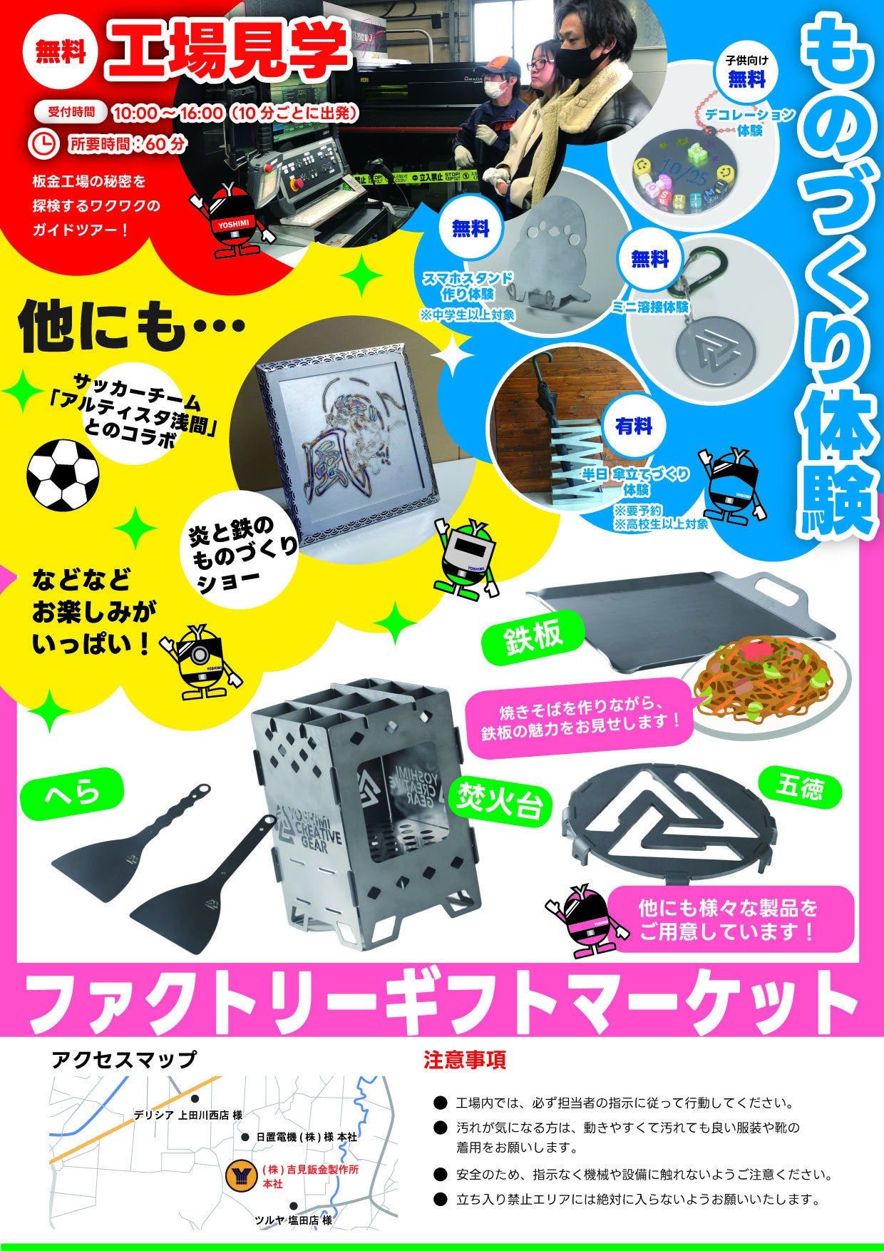 工場見学、溶接・板金体験、オリジナル商品の販売、社員によるライブアートなどを通じて、製造業の楽しさと奥深さを体感できます。入場無料(一部体験は有料)。