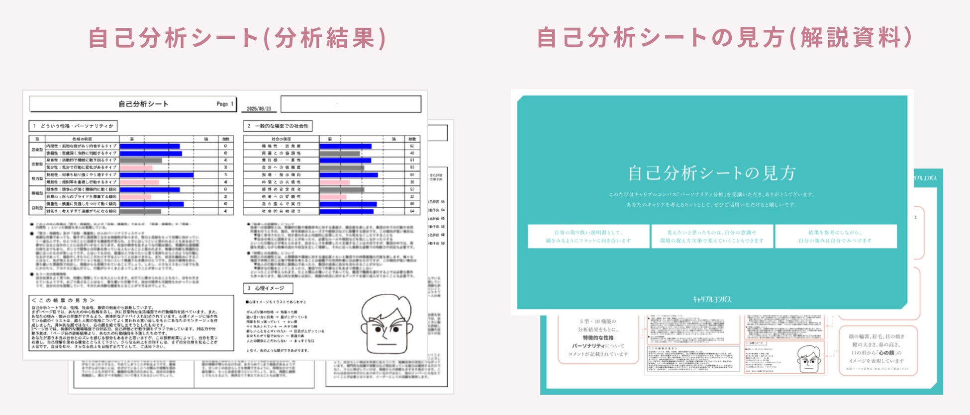 分析結果をもとに、自分の「らしさ」や「強み」を見つけることができます。サービスはオンラインで完結し、分析受検者にはキャリブルコンパスのオリジナル解説資料と、個別のコメントをセットでお届けします。
