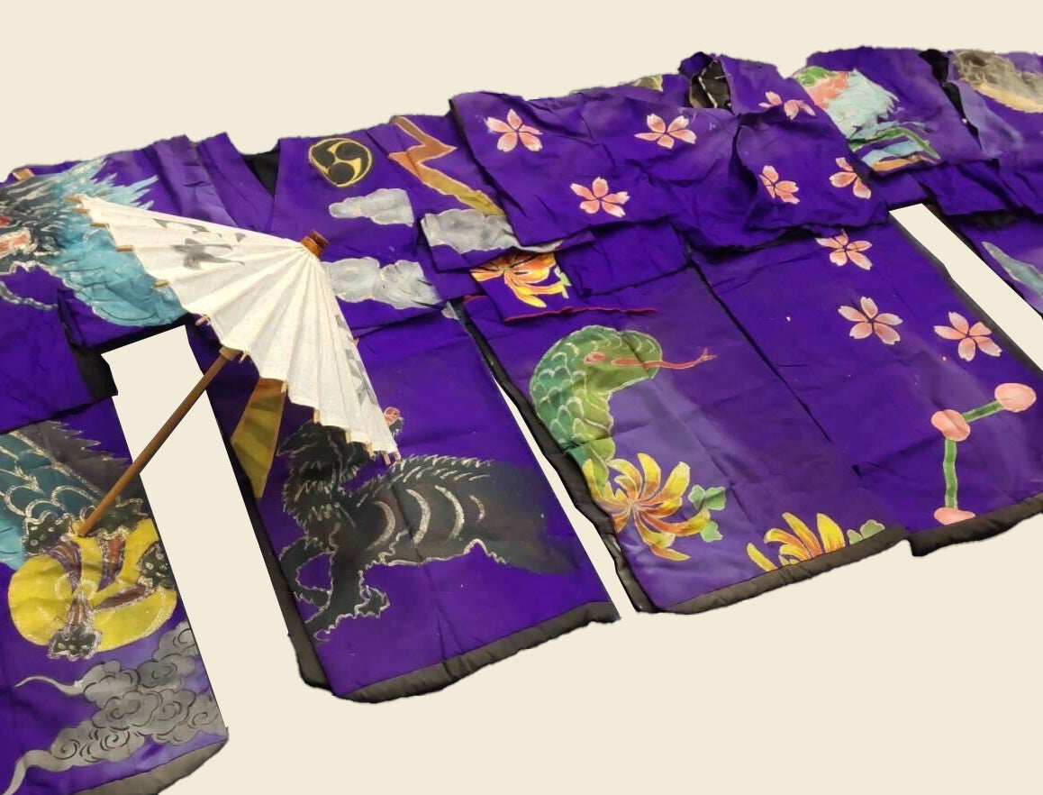 愛知県名古屋市中区・御園通商店街に設置されている「からくり時計 白浪五人男」の人形の旧衣装。「からくり時計 白浪五人男」は、1日5回、高さ12メートルのやぐらから人形が登場し、歌舞伎『青砥稿花紅彩画(白浪五人男)』の稲瀬川勢揃いの場面を再現するからくり時計である。本展では2022年のからくり時計リニューアル以前に人形が着用していた衣装を展示する。