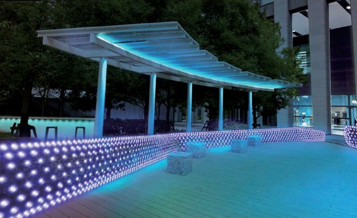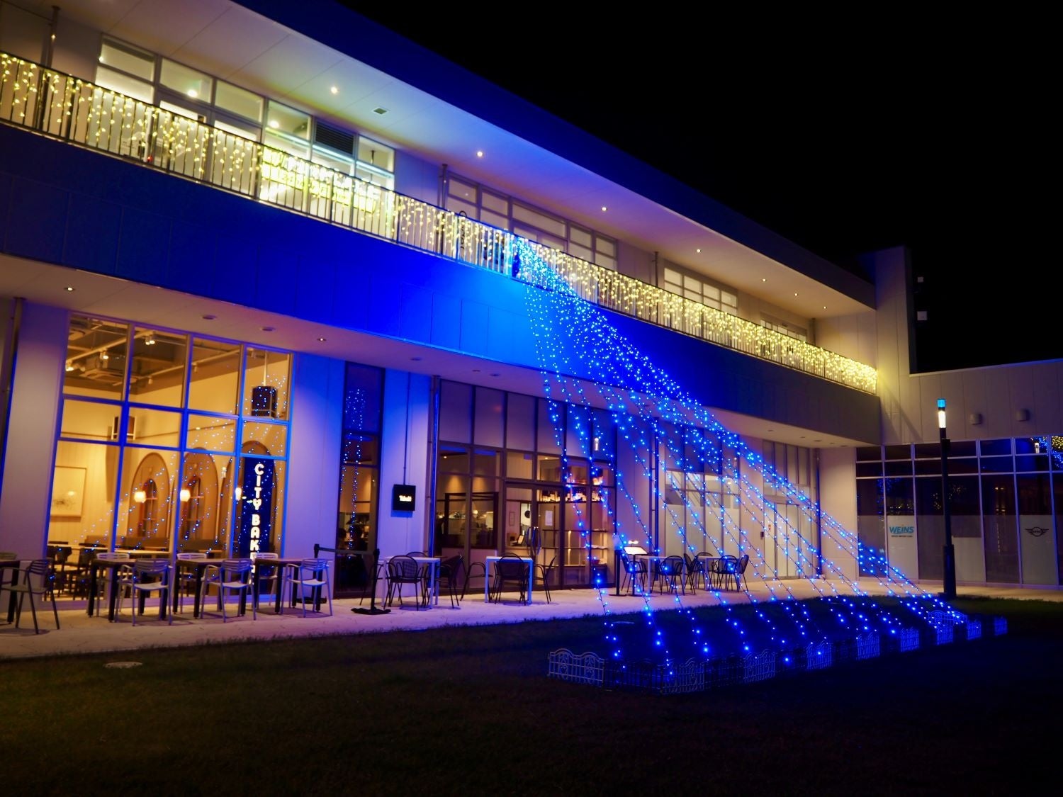 地域にも開かれ、人が集い、交流する「知の拠点」である神奈川大学みなとみらいキャンパスでは、「街とキャンパスをつなぐ光」をテーマに、スクールカラーであるプラウドブルーをモチーフとしてブルーのライティングをベースにした電飾で彩ります。