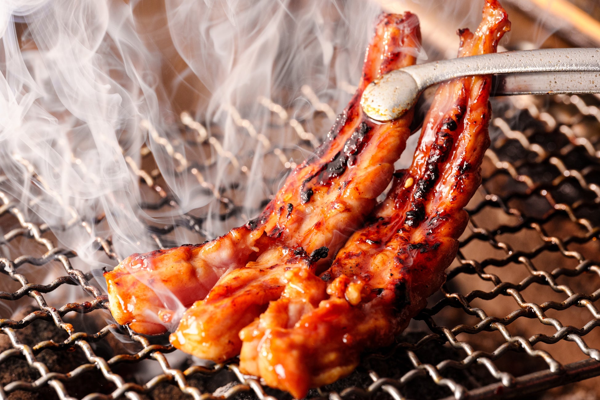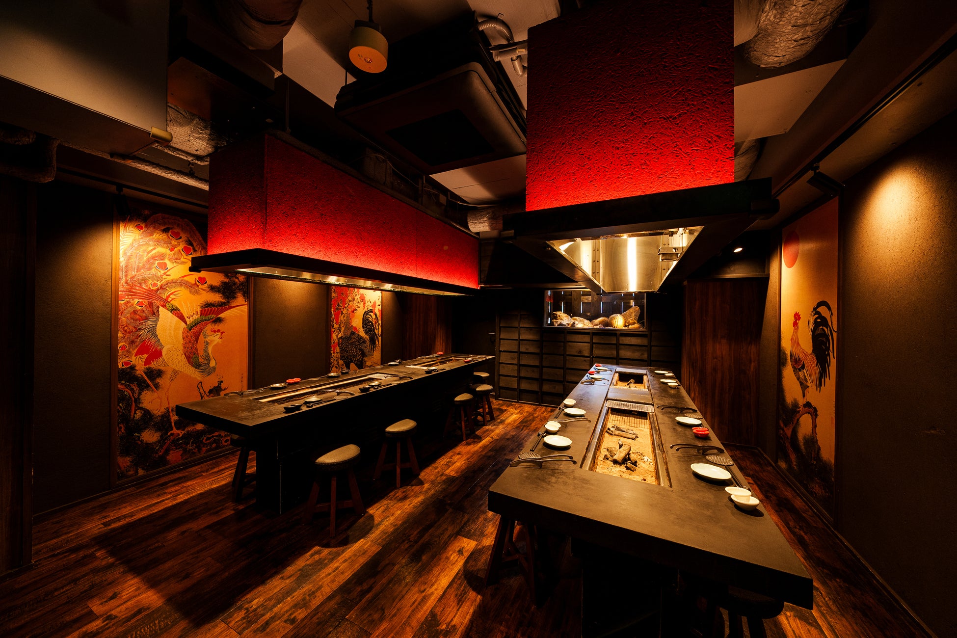 恵比寿駅から徒歩3分、洗練された和モダン空間に佇む『ファイヤーバード恵比寿』。店内で捌いた地鶏と鴨を目の前の囲炉裏で炭火焼きにする、新感覚の焼き鳥が楽しめる「鶏焼肉」は、柔らかさと旨味が官能的に広がる逸品です。