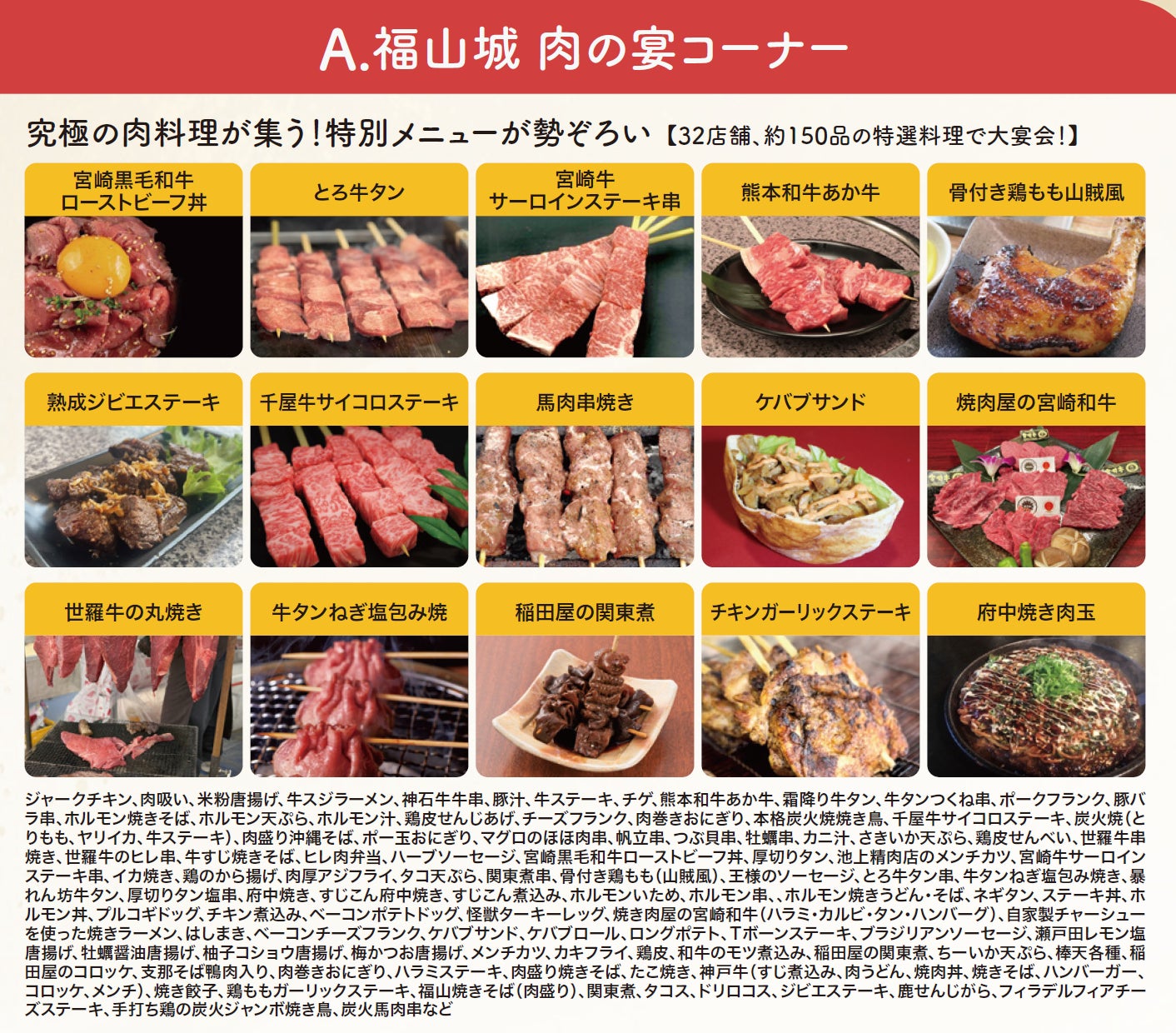 ①肉の大宴会:究極の肉料理が福山城に大集結。32店舗、約150品の特選料理が集う福山最大級の肉の宴