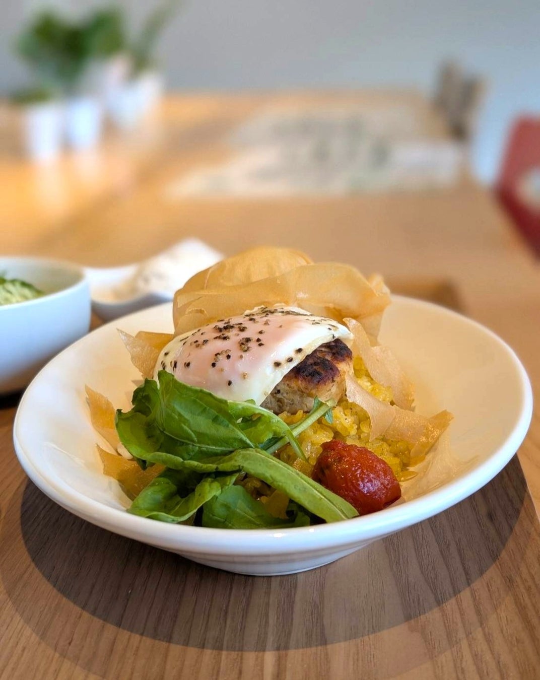 そして、カフェのランチメニューにも野菜や大豆製品などのヘルシーな素材がたっぷり使われています。多くのメニューで肉の代わりに大豆ミートやうす揚げなどを活用していますが、丁寧な下ごしらえによりお肉と変わらない食感や食べごたえに仕上がっています。オイルやチーズも植物性のものを使っているためか、お客様からは「ドリアを食べても胃が重く感じない」といった声も。長年カフェで経験を積んできた料理人が試作を重ねレシピを色々と工夫したことで、優しいけれどしっかり滋味を感じられる味わいと、日本らしい素材をメインにしつつも洋食らしさを楽しめるメニューが揃いました。