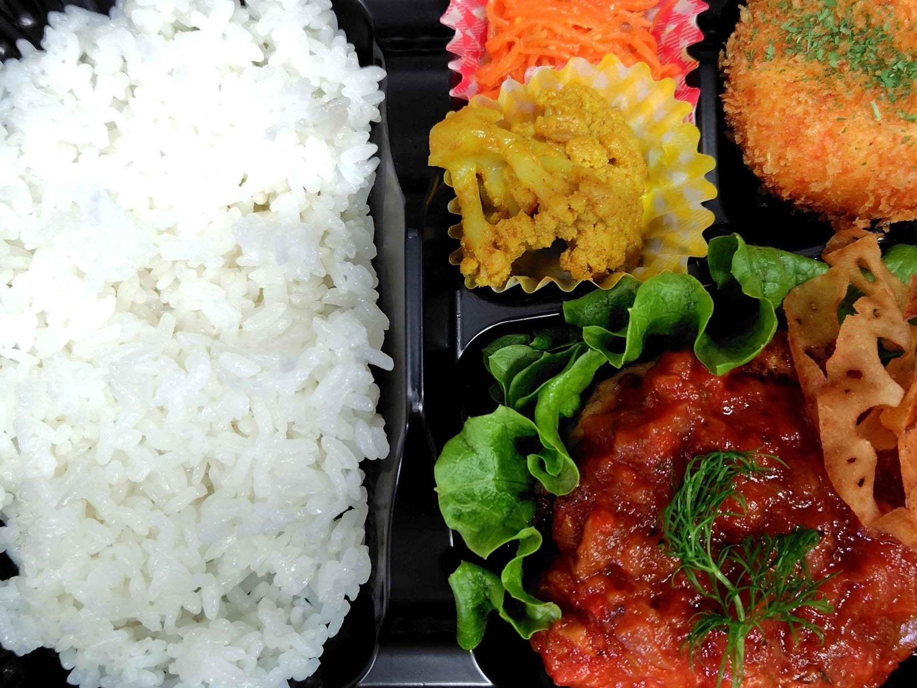■鶏のひき肉と豆腐や野菜を混ぜ合わせたハンバーグとカレー風味のライスが一緒になっており、和洋両方のテイストを感じてもらえます。