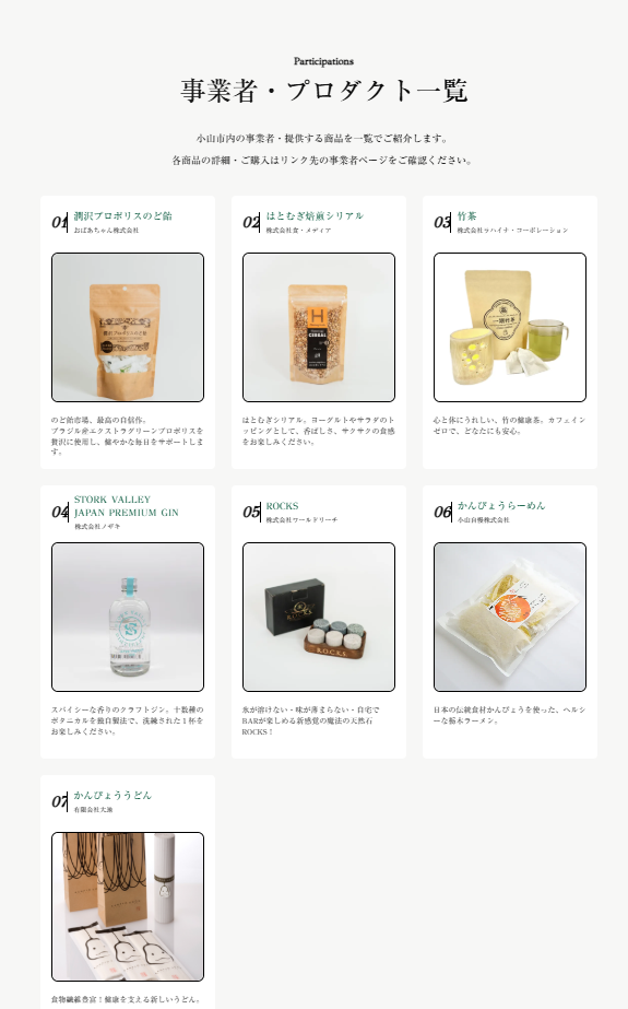 本サイトは、昨年度に実施した海外インフルエンサーによるテストマーケティング事業の成果をもとに、小山市内の中小企業7社が海外市場に向けて発信を行う新たな拠点です。