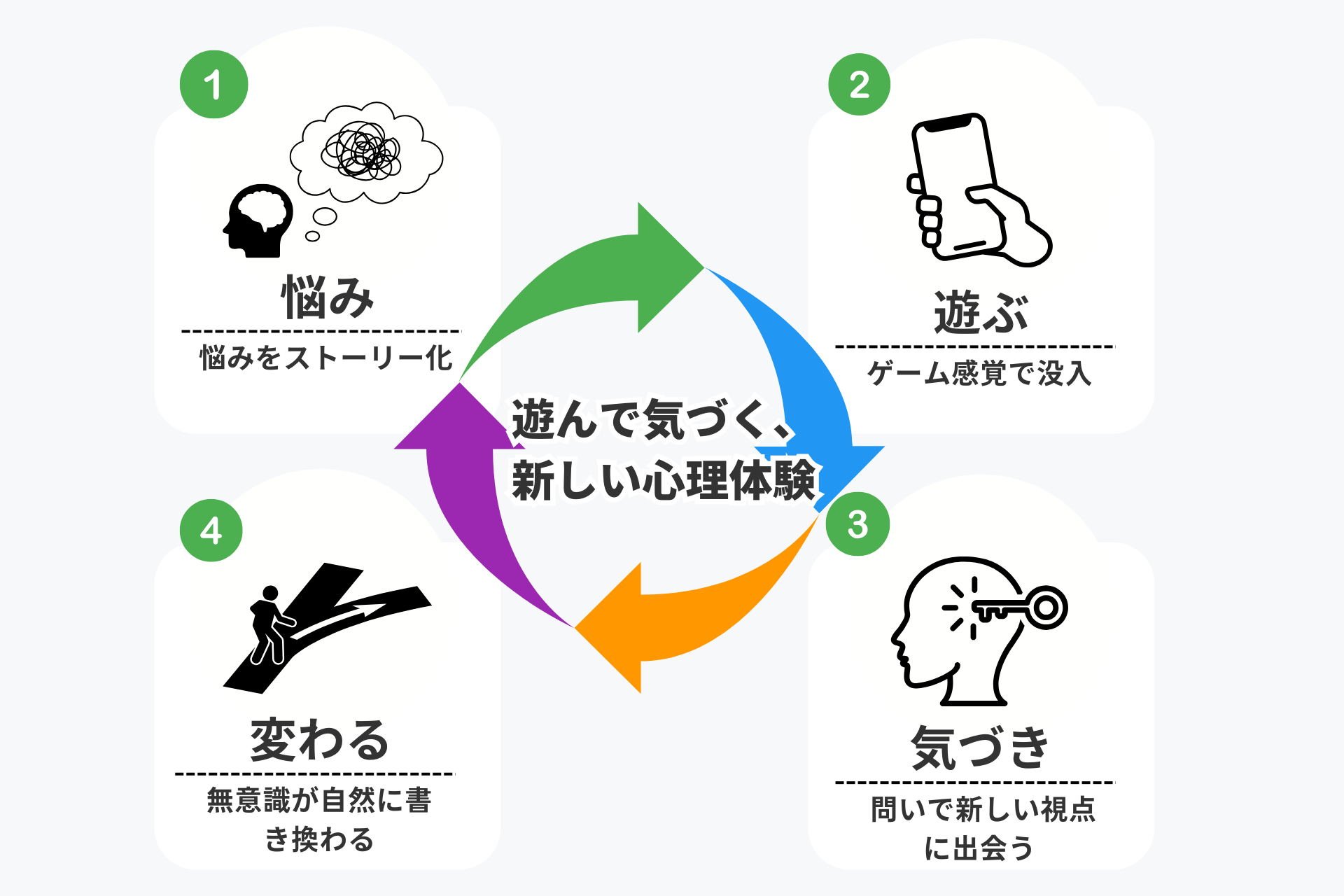 これらの要素をゲームに取り入れることで、人は自然に没頭し、楽しみながら気づきを定着させていきます。自分の中にある思い込みや無意識のパターンに気づき、それを自然に手放し、より心地よい新しい考え方へと切り替えられることで実施者自身が成長を体験できることを目指しています。