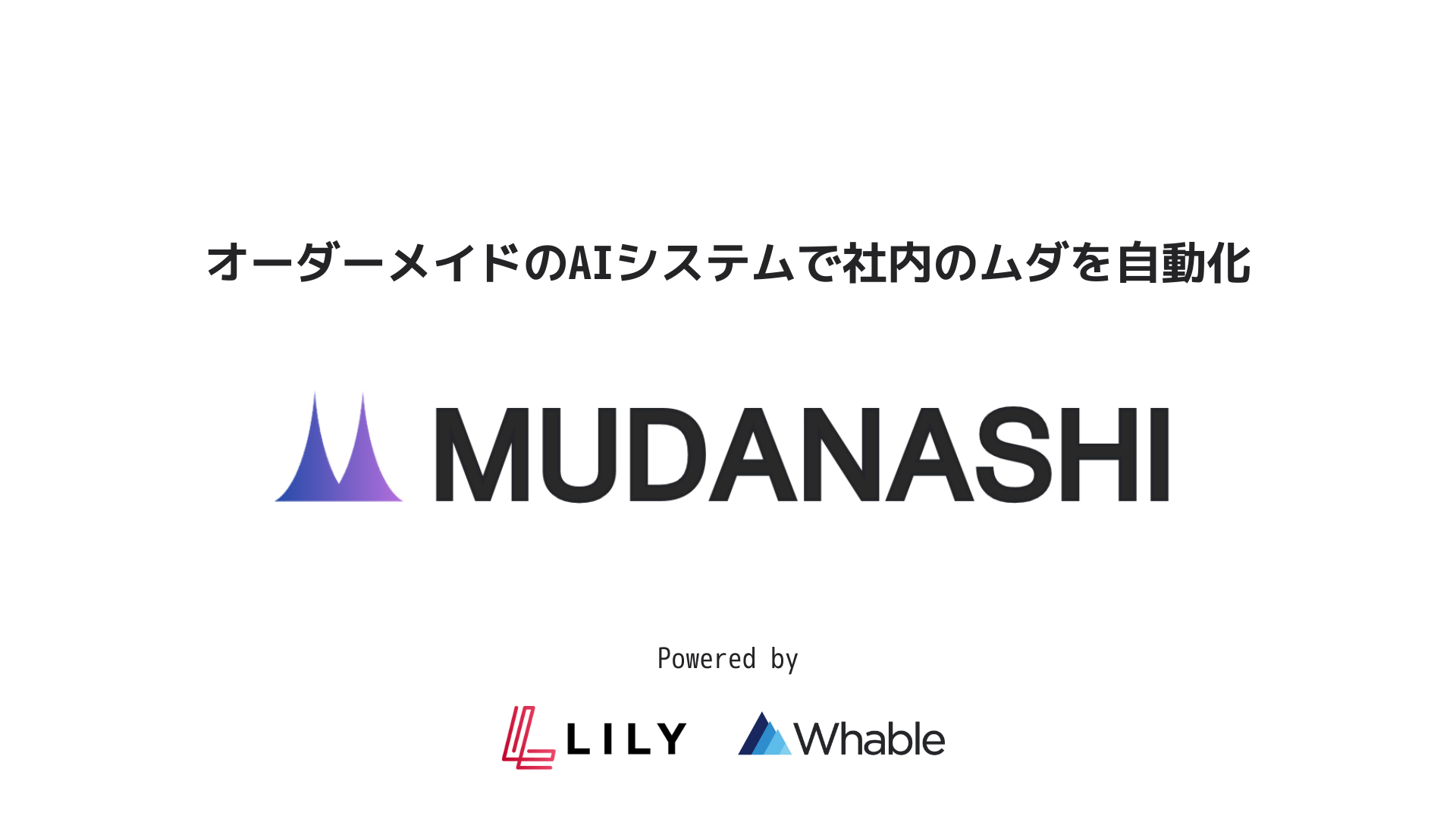 「ムダナシ」は、株式会社リリーが持つスピーディーなシステム開発力と、株式会社Whableの業務可視化コンサルティングを組み合わせ、企業の潜在的な「ムダ」を発見し、AIとの協働を前提とした業務プロセスの「再設計」から「開発・実装」までをワンストップで支援するサービスです。