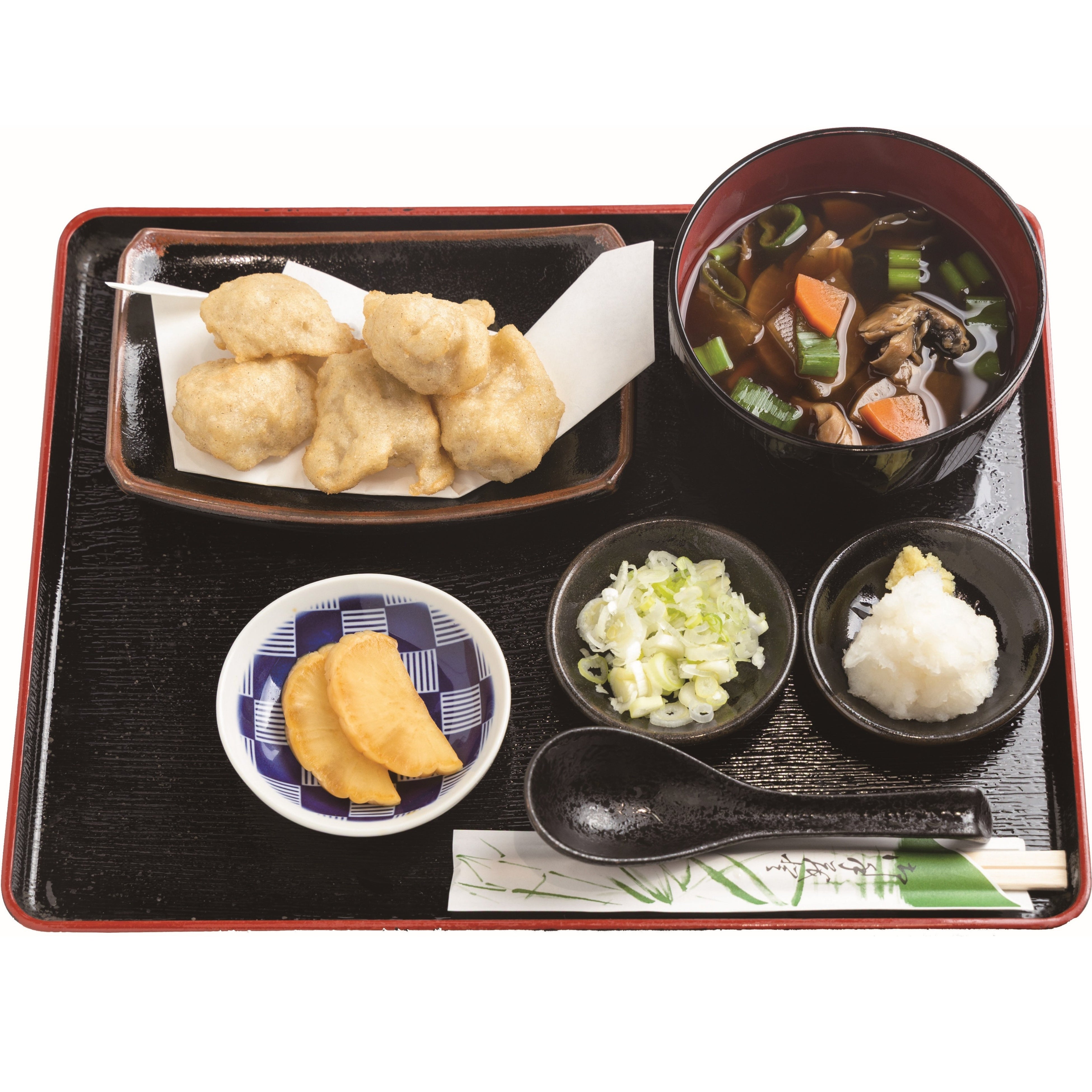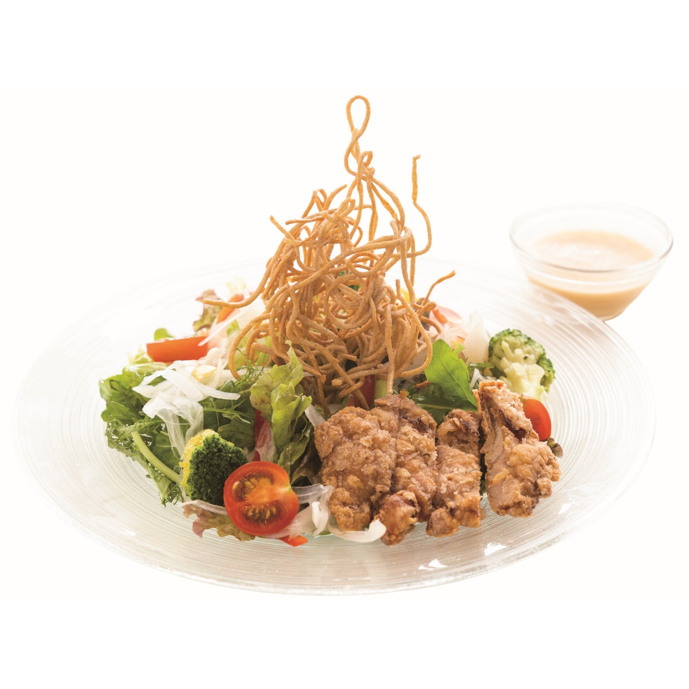 蕎麦の生産から手打ちまで一貫して行う同駅内そば店「夢玄」特製の打ち立て蕎麦を使ったシン・茨城あげそば。旬の地野菜たっぷりに生酵素たっぷりの玉ねぎドレッシングで食べる豪華な内容。レストラン自慢の唐揚げが付いて食べ応えも十分です。