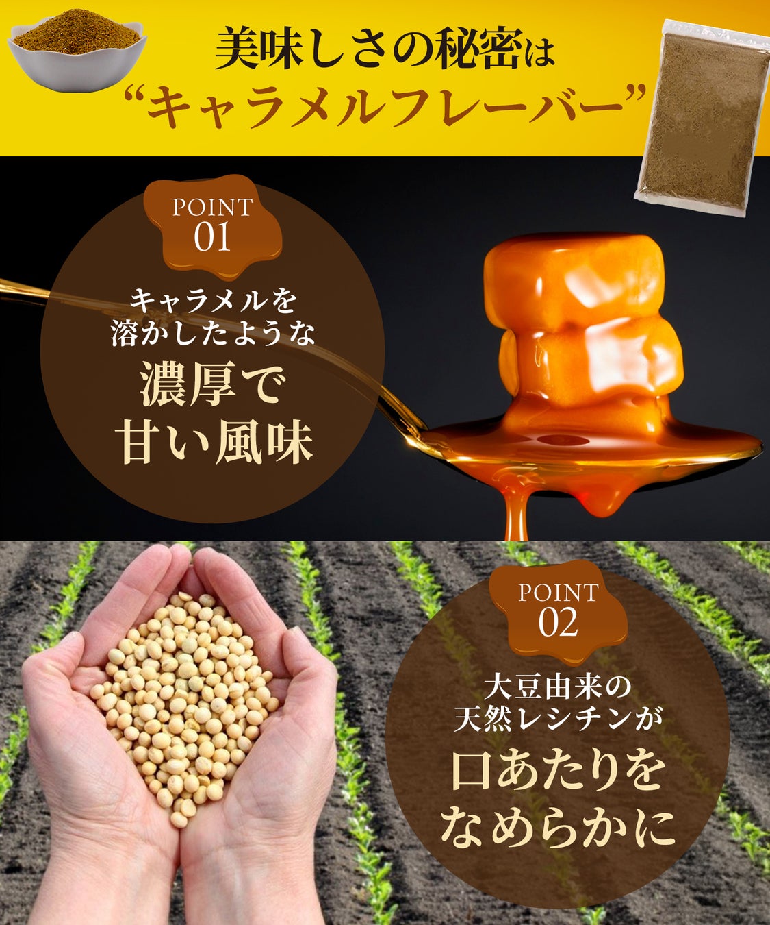 キャラメルを溶かしたようなコク深い甘み。大豆由来の天然レシチン配合で、口あたりがなめらかに。
