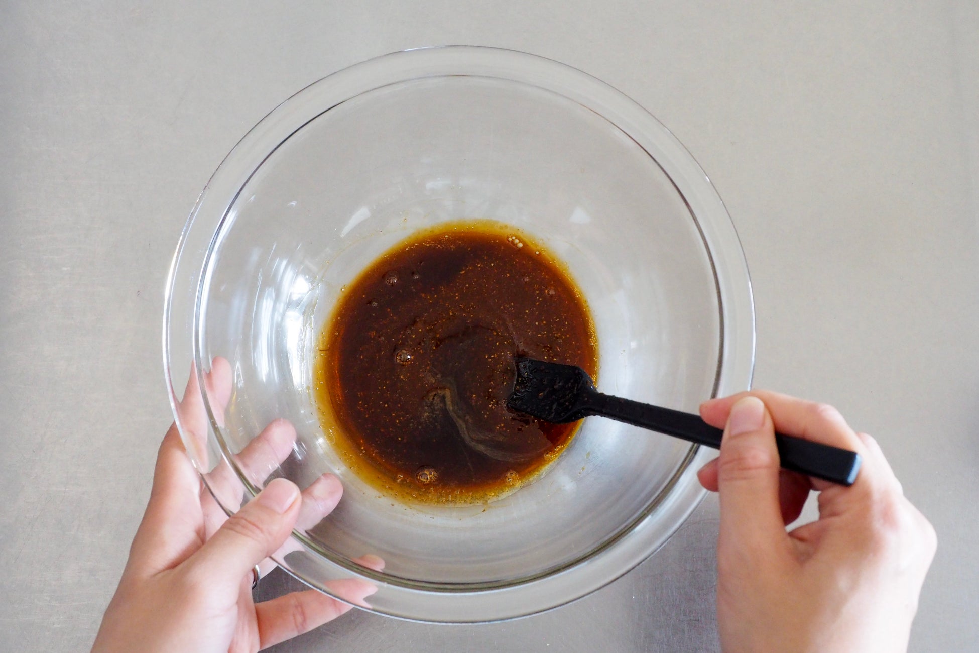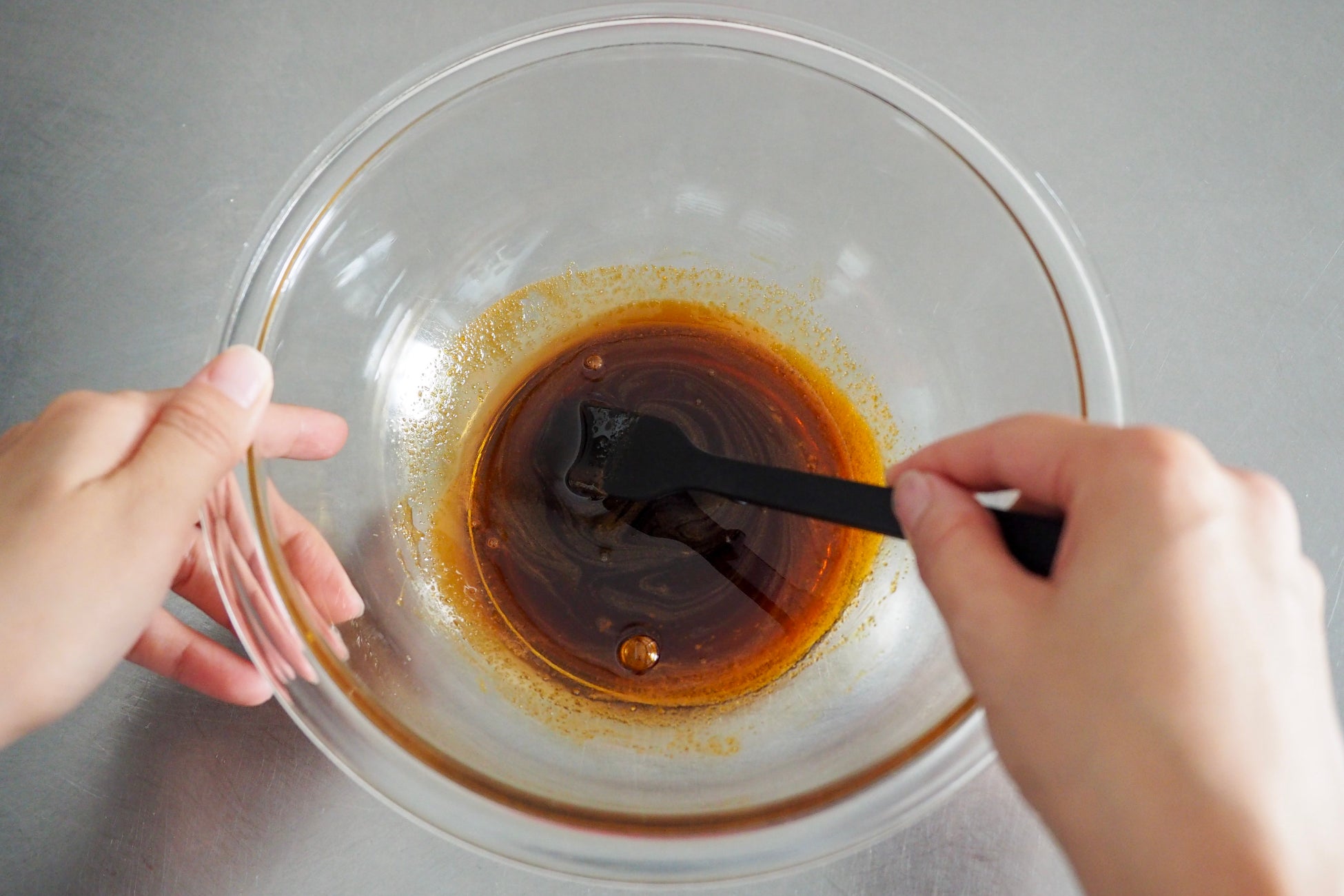 3,耐熱容器にキャラメルフレーバーと水を入れてよく混ぜる