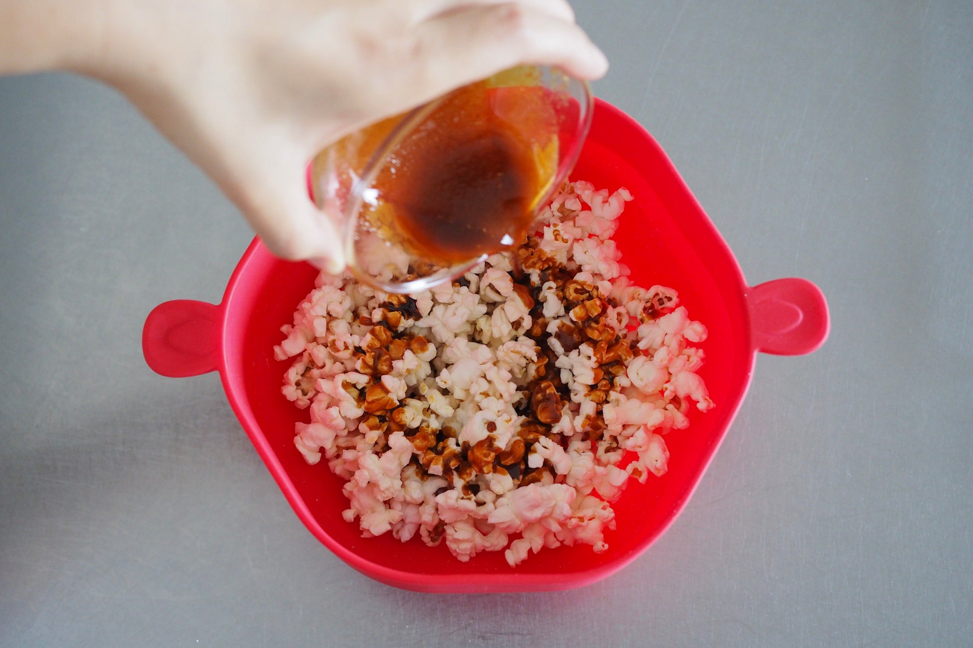 5,ポップコーンに溶けたキャラメルフレーバーを回しかけ、ゴムベラでよく混ぜる。
