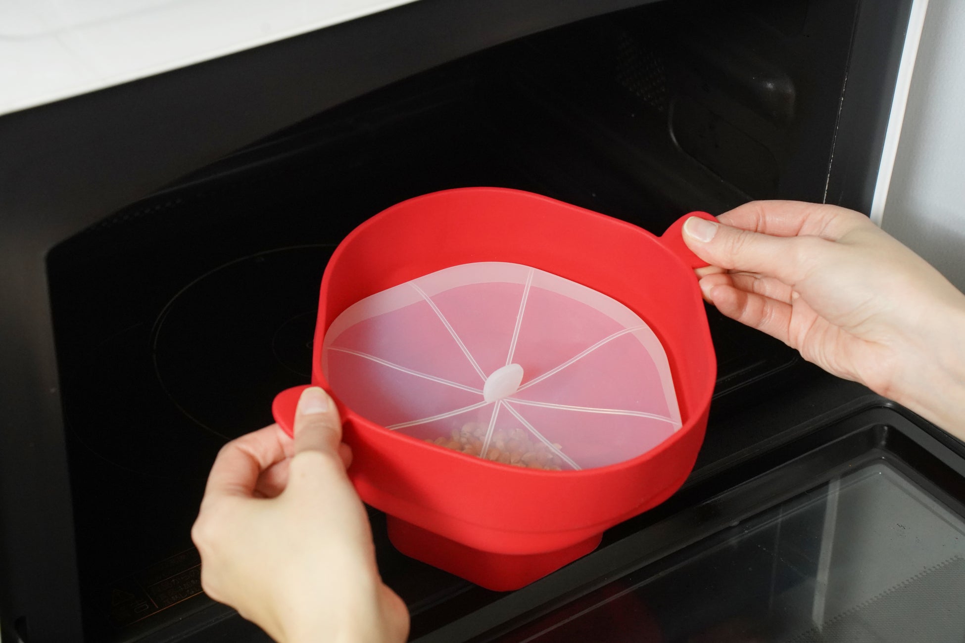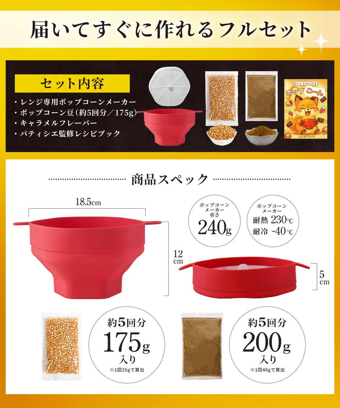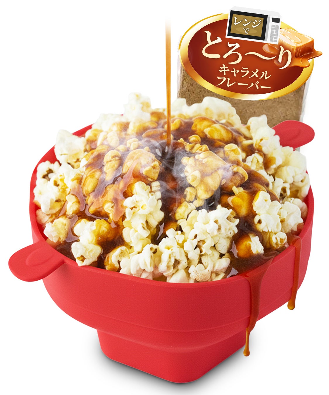 レンジ専用ポップコーンメーカー/ポップコーン豆(約5回分・175g)/キャラメルフレーバー(約5回分・200g)/パティシエ兼管理栄養士監修レシピブック(15レシピ)