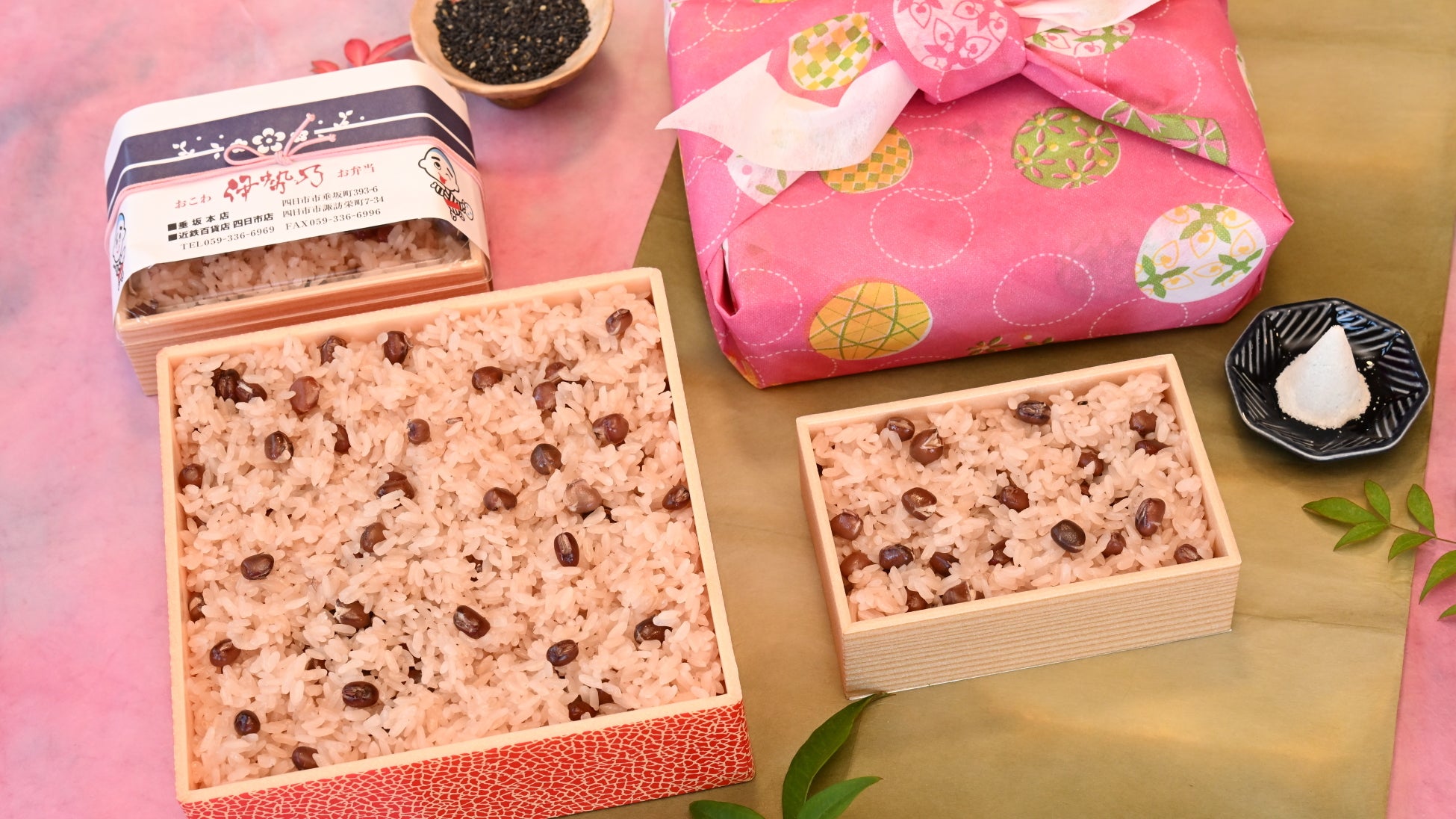 伊勢乃で販売している赤飯は、垂坂本店および近鉄百貨店四日市店にて、ご自宅用から贈答用の化粧箱詰まで各種取り揃えています。