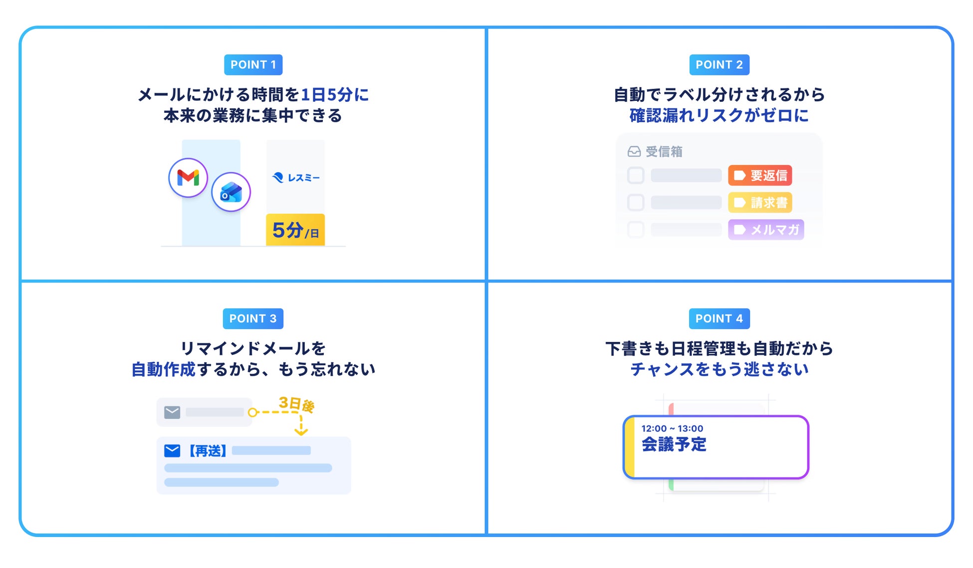 レスミーは、AIがメール対応とスケジュール管理を自動化するオールインワン秘書ツールです。