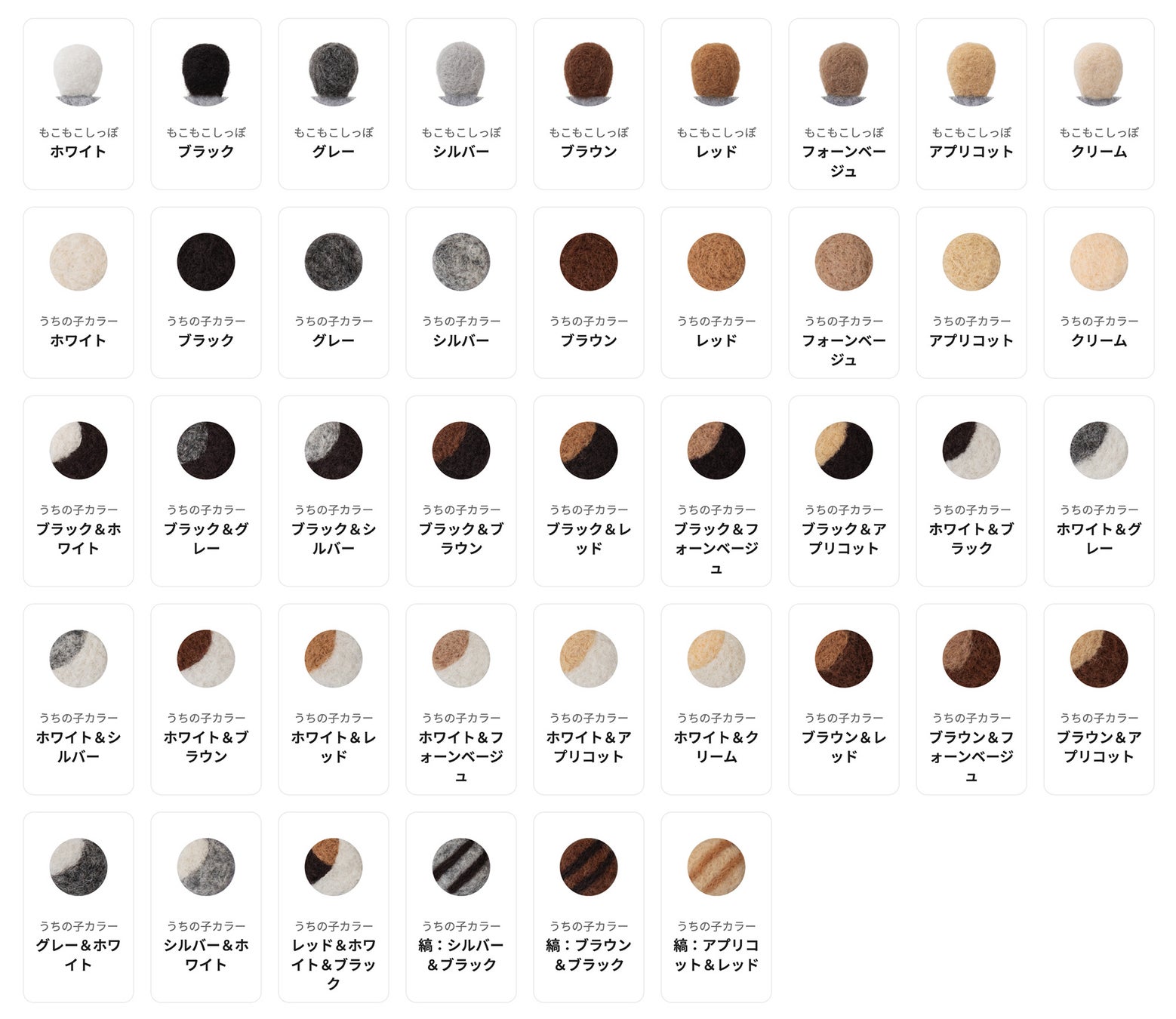 しっぽの骨壷は2シリーズ。毛色や模様をイメージして選べる〈うちの子カラー〉と、ふんわりまあるい〈もこもこしっぽ〉。全42種類のカラーと4サイズに加え、本体カラー(ホワイト/グレー)を組み合わせることで、バリエーションは最大336通り。