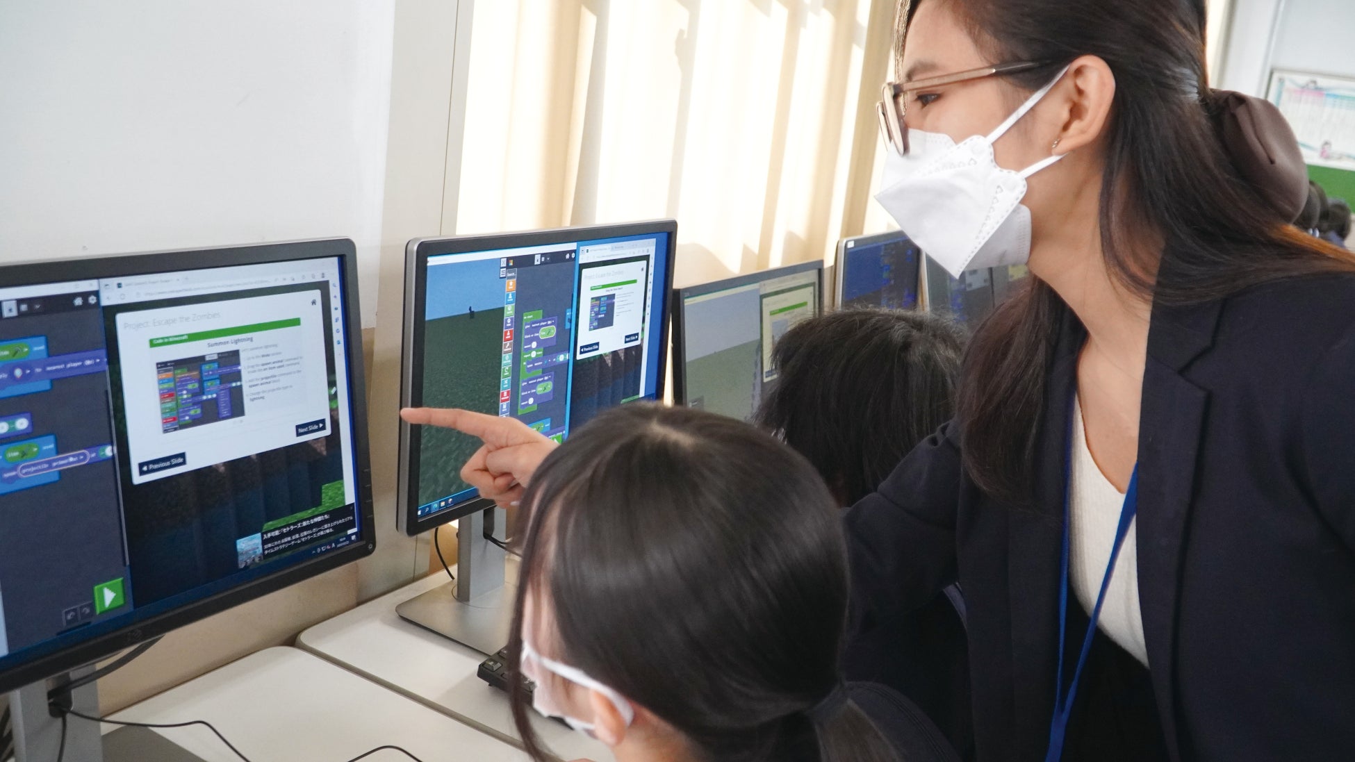 V-codeは児童・生徒が自立して学習出来るよう、スライドを見てプログラミングの知識や考え方を自分で学習するシステムになっている。また、児童が組んだプログラミングが正しいかを自動で判定する機能も搭載されており、プログラミング授業未経験の先生でも負担なく授業を行うことが可能となっている。