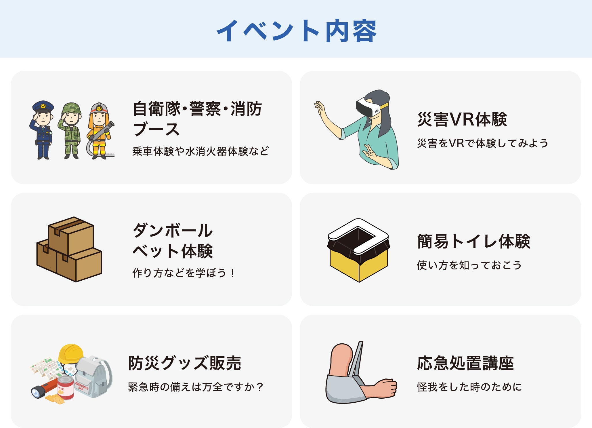 本イベントでは、防災に関する専門的な知識だけでなく、"自助"の意識を持ち、いざという時に「自分自身や身近な人に手を差し伸べられる力」を育むことを目的とし日常からの備え・判断・行動につながる体験型の学びの場を創出いたします。