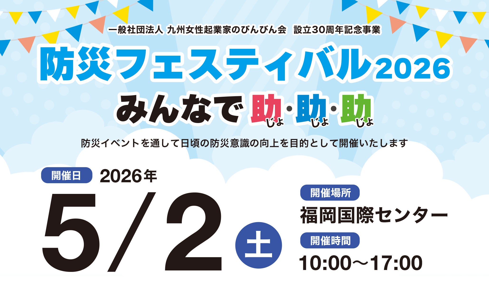 これまで複数回に渡って春日公園にて開催してまいりました防災フェスティバルですが、一般社団法人九州女性起業家のびんびん会の設立30周年にあたる2026年の開催は規模を拡大し開催させていただきます。
