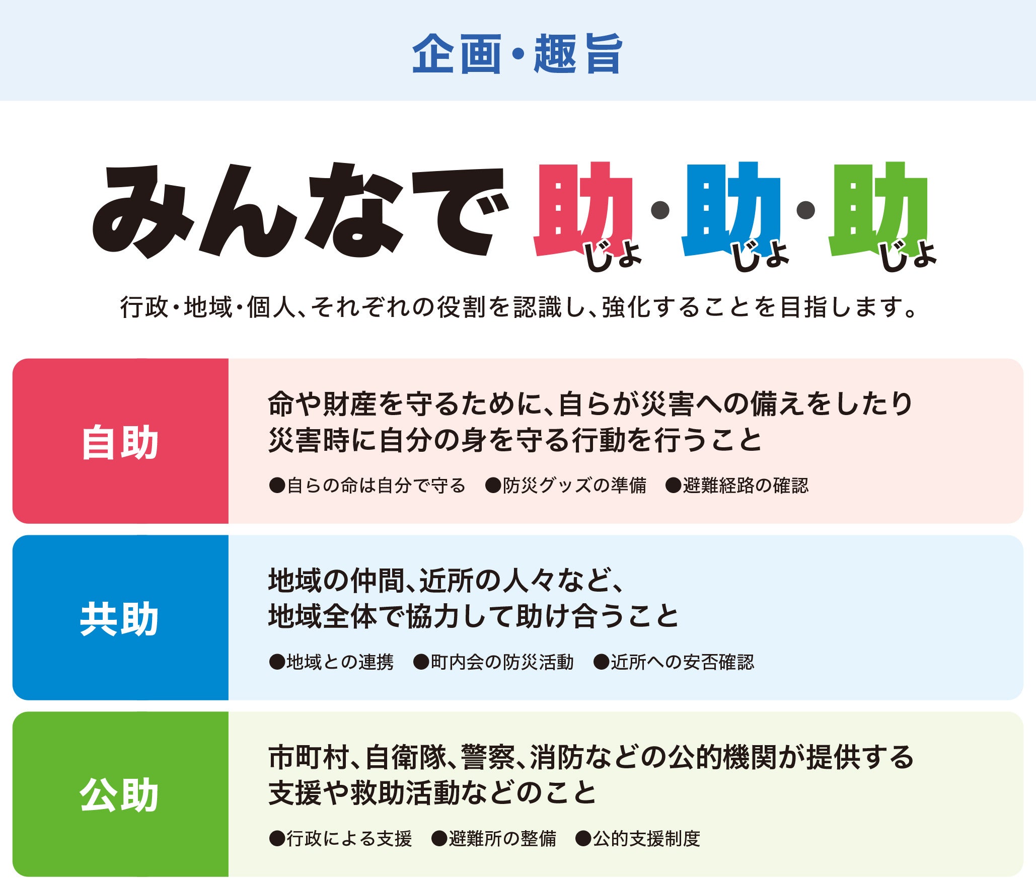 東日本大震災、熊本地震、西日本豪雨などの大規模災害を教訓に、私たちは防災・減災への意識を一人ひとりが高めることが社会全体の【再生する力】につながると考えています。特に、社会的に支援が届きにくい立場にある方々に寄り添い、共に未来を考えることを基本理念とし、「あいさつ声掛けから始まる地域づくり」の実現を目指しています。