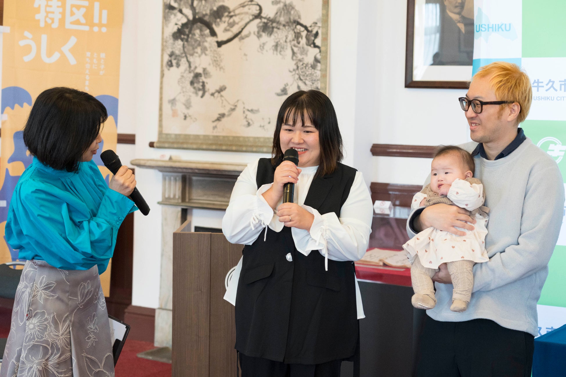 当日、式に参加した市内在住の塚本さんは、「記念となるボトルでとてもうれしいです」と笑顔を見せました。また、移住のきっかけを尋ねられた互さんは、「結婚を機に引っ越してきたのですが、自然も多く落ち着いた環境の中で子育てができると思って牛久を選びました」と、牛久市の魅力を語りました。