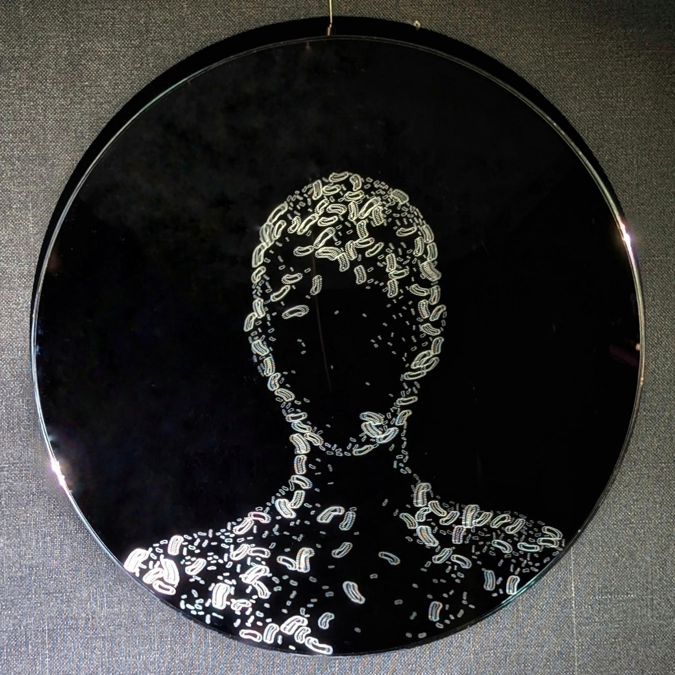 『菌の鏡/Microbiome Mirror』は、私たちと共生する常在菌へのまなざしを見つめ直す作品です。鏡面に彫られた微細なバクテリアの像が、鑑賞者の顔と重なり合い、除菌一辺倒の風潮に対して共生する視点を喚起します。