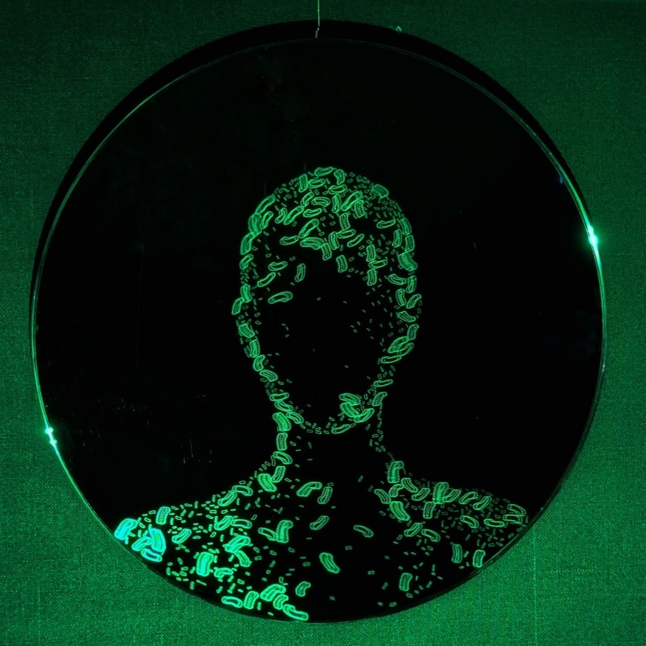 私たちの身体はおよそ37兆個の細胞で構成されていますが、細胞の数以上の“菌”が共生しています。このミラーは、そんな見えない存在に形を与える実験的な作品です。